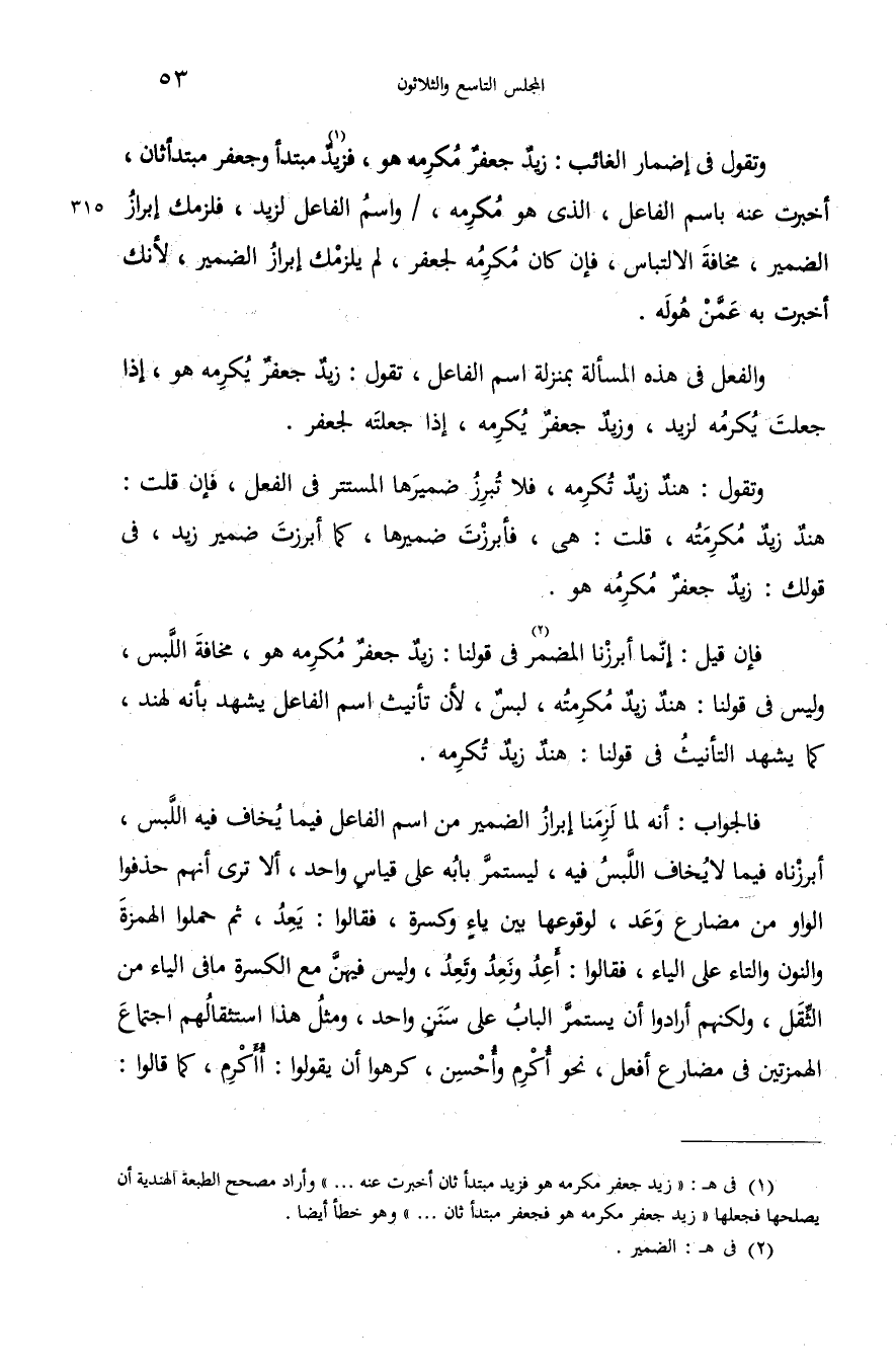 وتقول فى إضمار الغائب: زيد جعفر مكرمه هو، فزيد (¬1) مبتدأ وجعفر مبتدأ ثان، أخبرت عنه باسم الفاعل، الذى هو مكرمه، /واسم الفاعل لزيد، فلزمك إبراز الضمير، مخافة الالتباس، فإن كان مكرمه لجعفر، لم يلزمك إبراز الضمير، لأنك أخبرت به عمّن هوله.