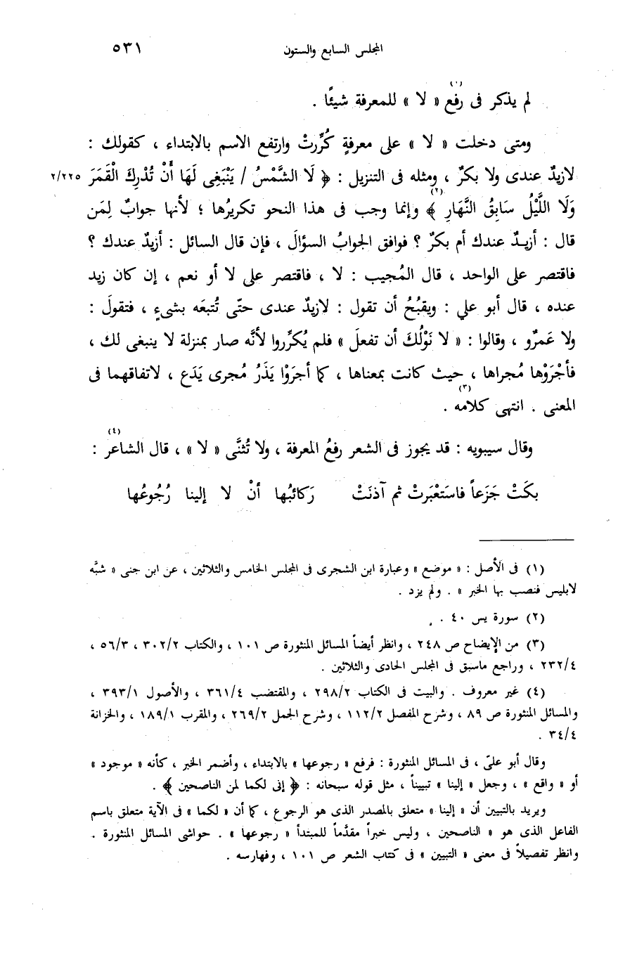 (¬3) من الإيضاح ص 248، وانظر أيضا المسائل المنثورة ص 101، والكتاب 2/ 302،3/ 56، 4/ 232، وراجع ما سبق فى المجلس الحادى والثلاثين.