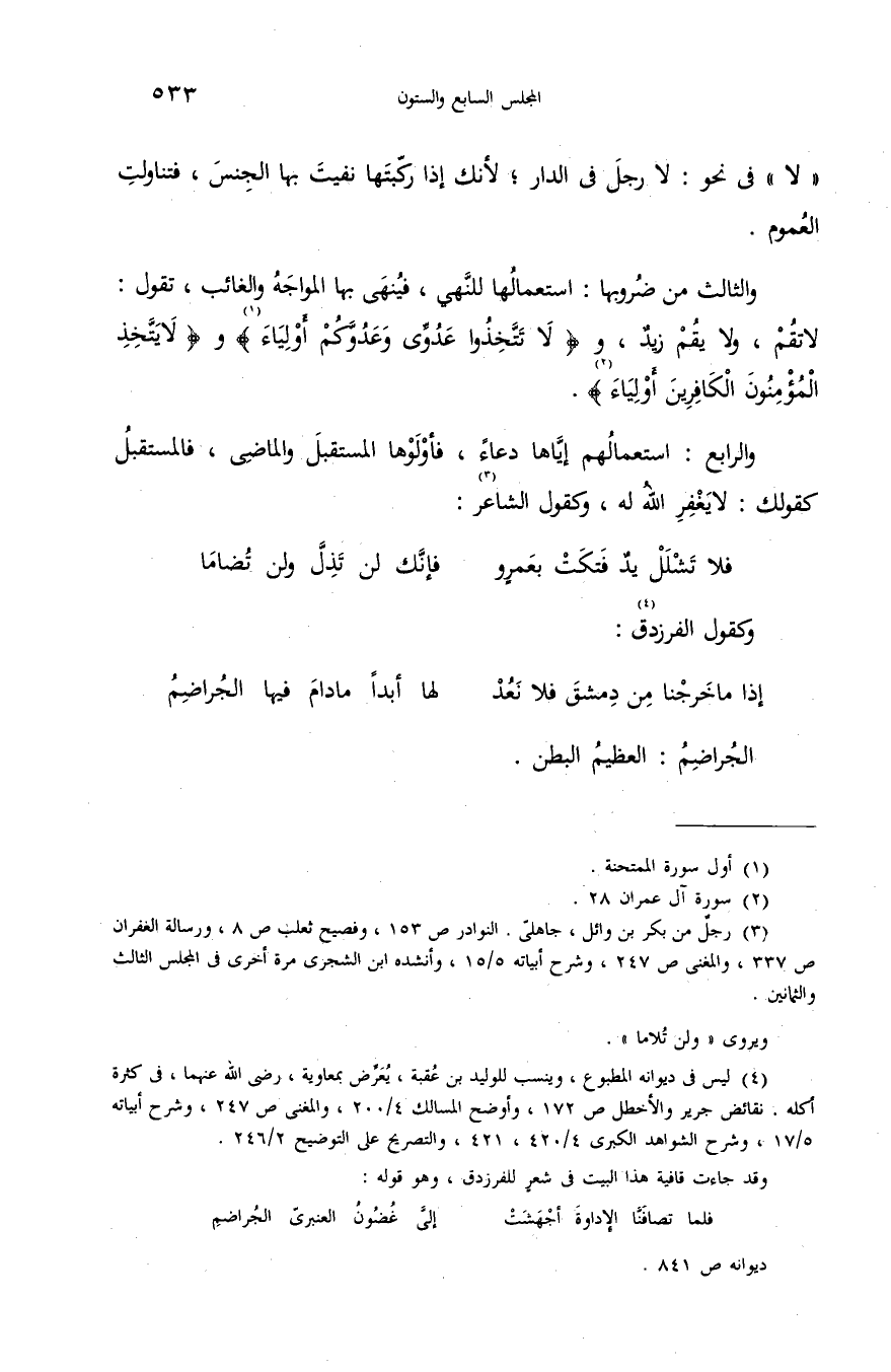 (¬3) رجل من بكر بن وائل، جاهلىّ. النوادر ص 153، وفصيح ثعلب ص 8، ورسالة الغفران ص 337، والمغنى ص 247، وشرح أبياته 5/ 15، وأنشده ابن الشجرى مرة أخرى فى المجلس الثالث والثمانين. ويروى «ولن تلاما».