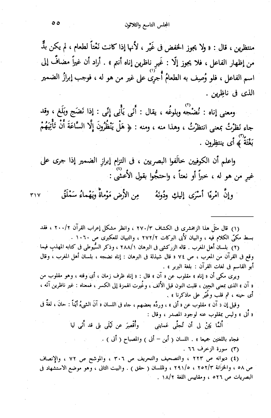 منتظرين، قال: «ولا يجوز الخفض فى غير، لأنها إذا كانت نعتا لطعام، لم يكن بدّ من إظهار الفاعل، فلا يجوز إلاّ: غير ناظرين إناه أنتم». أراد أن غيرا مضاف إلى اسم الفاعل، فلو وصف به الطعام أجرى (¬1) على غير من هو له، فوجب إبراز الضمير الذى فى ناظرين.