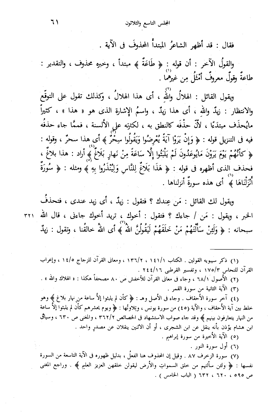 {كَأَنَّهُمْ يَوْمَ يَرَوْنَ ما يُوعَدُونَ لَمْ يَلْبَثُوا إِلاّ ساعَةً مِنْ نَهارٍ بَلاغٌ} (¬4) أراد: هذا بلاغ، فحذف الذى أظهره فى قوله: {هذا بَلاغٌ لِلنّاسِ وَلِيُنْذَرُوا بِهِ} (¬5) ومثله: {سُورَةٌ أَنْزَلْناها} (¬6) أى هذه سورة أنزلناها.