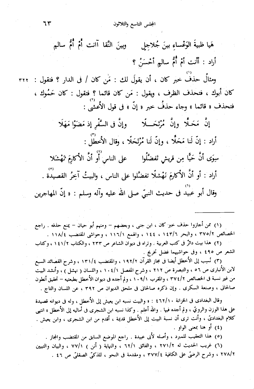 (¬1) ممن أجازوا حذف خبر كان، ابن جنى، وبعضهم-ومنهم أبو حيان-يمنع حذفه. راجع الخصائص 2/ 375، والبحر 6/ 143،144، والهمع 1/ 116، وحواشى المقتضب 4/ 118.