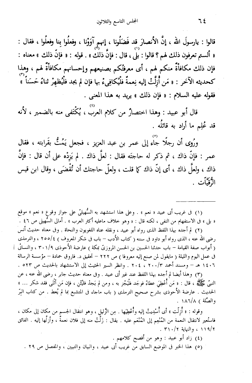 (¬2) لم أجده بهذا اللفظ الذى رواه أبو عبيد، ونقله عناه اللغويون والنحاة. وفى معناه حديث أنس رضى الله عنه، الذى رواه أبو داود فى سننه (كتاب الأدب-باب فى شكر المعروف) 4/ 255، والترمذى (أبواب صفة القيامة-باب حدثنا الحسين بن الحسن المروزىّ بمكة) عارضة الأحوذى 9/ 301، والنسائى فى عمل اليوم والليلة (ما يقول لمن صنع إليه معروفا) ص 222 - تحقيق د. فاروق حمادة-مؤسسة الرسالة 1406 هـ-ومسند أحمد 3/ 200،204. وانظر السير الحثيث إلى الاستشهاد بالحديث ص 523.