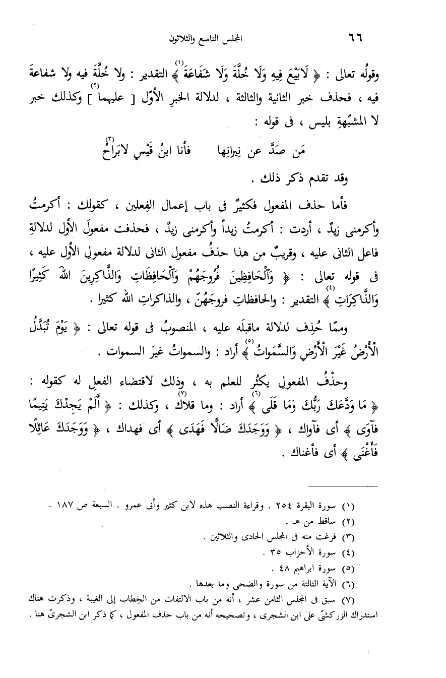 (¬7) سبق فى المجلس الثامن عشر، أنه من باب الالتفات من الخطاب إلى الغيبة، وذكرت هناك استدراك الزركشىّ على ابن الشجرى، وتصحيحه أنه من باب حذف المفعول، كما ذكر ابن الشجرىّ هنا.