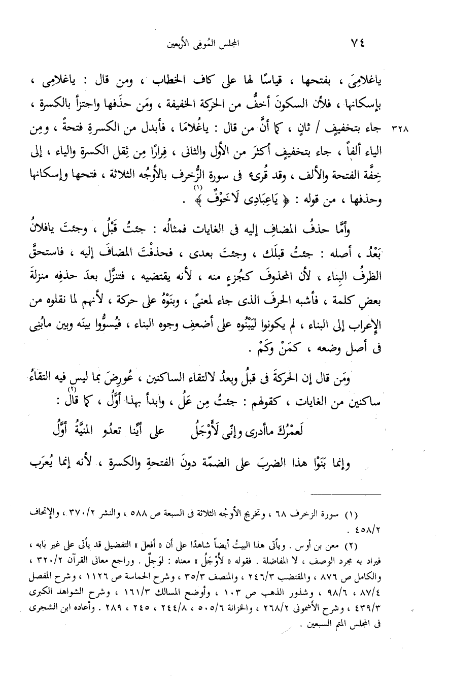 يا غلامى، بفتحها، قياسا لها على كاف الخطاب، ومن قال: يا غلامى، بإسكانها، فلأن السكون أخفّ من الحركة الخفيفة، ومن حذفها واجتزأ بالكسرة، جاء بتخفيف/ثان، كما أنّ من قال: يا غلاما، فأبدل من الكسرة فتحة، ومن الياء ألفا، جاء بتخفيف أكثر من الأول والثانى، فرارا من ثقل الكسرة والياء، إلى خفّة الفتحة والألف، وقد قرئ فى سورة الزّخرف بالأوجه الثلاثة، فتحها وإسكانها وحذفها، من قوله: {يا عِبادِ لا خَوْفٌ} (¬1).