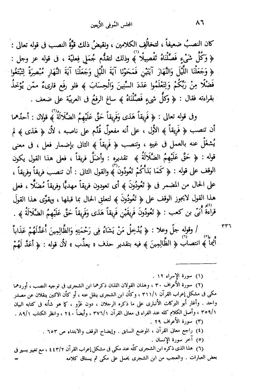 (¬6) هذا الذى ذكره ابن الشجرى كلّه عند مكى فى مشكل إعراب القرآن 2/ 443، مع تغيير يسير فى بعض العبارات. والعجب من ابن الشجرى يحمل على مكى ثم يستاق كلامه-