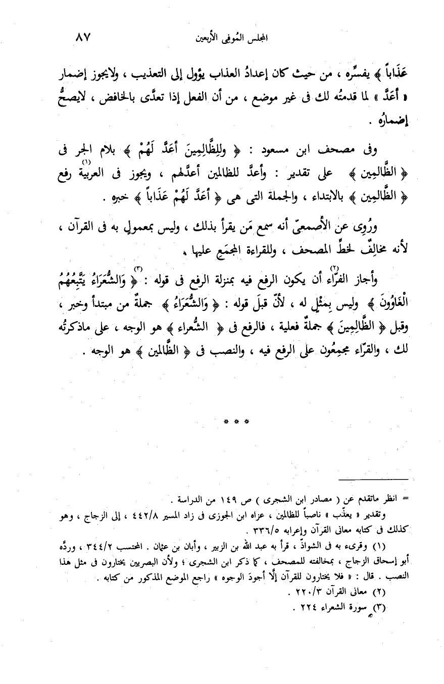 = انظر ما تقدم عن (مصادر ابن الشجرى) ص 149 من الدراسة. وتقدير «يعذّب» ناصبا للظالمين، عزاه ابن الجوزى فى زاد المسير 8/ 442، إلى الزجاج، وهو كذلك فى كتابه معانى القرآن وإعرابه 5/ 336.