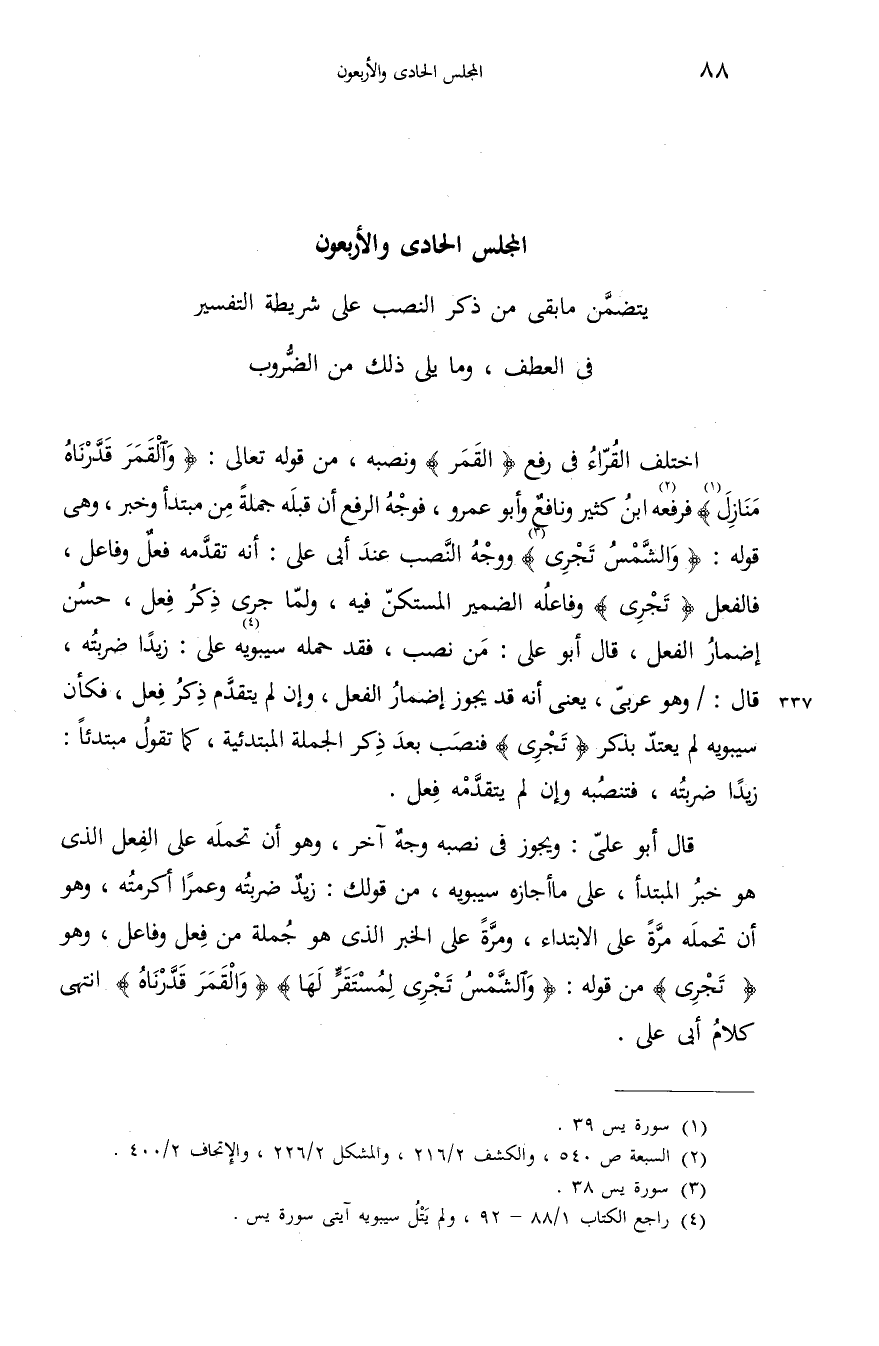 (¬4) راجع الكتاب 1/ 88 - 92، ولم يتل سيبويه آيتى سورة يس.