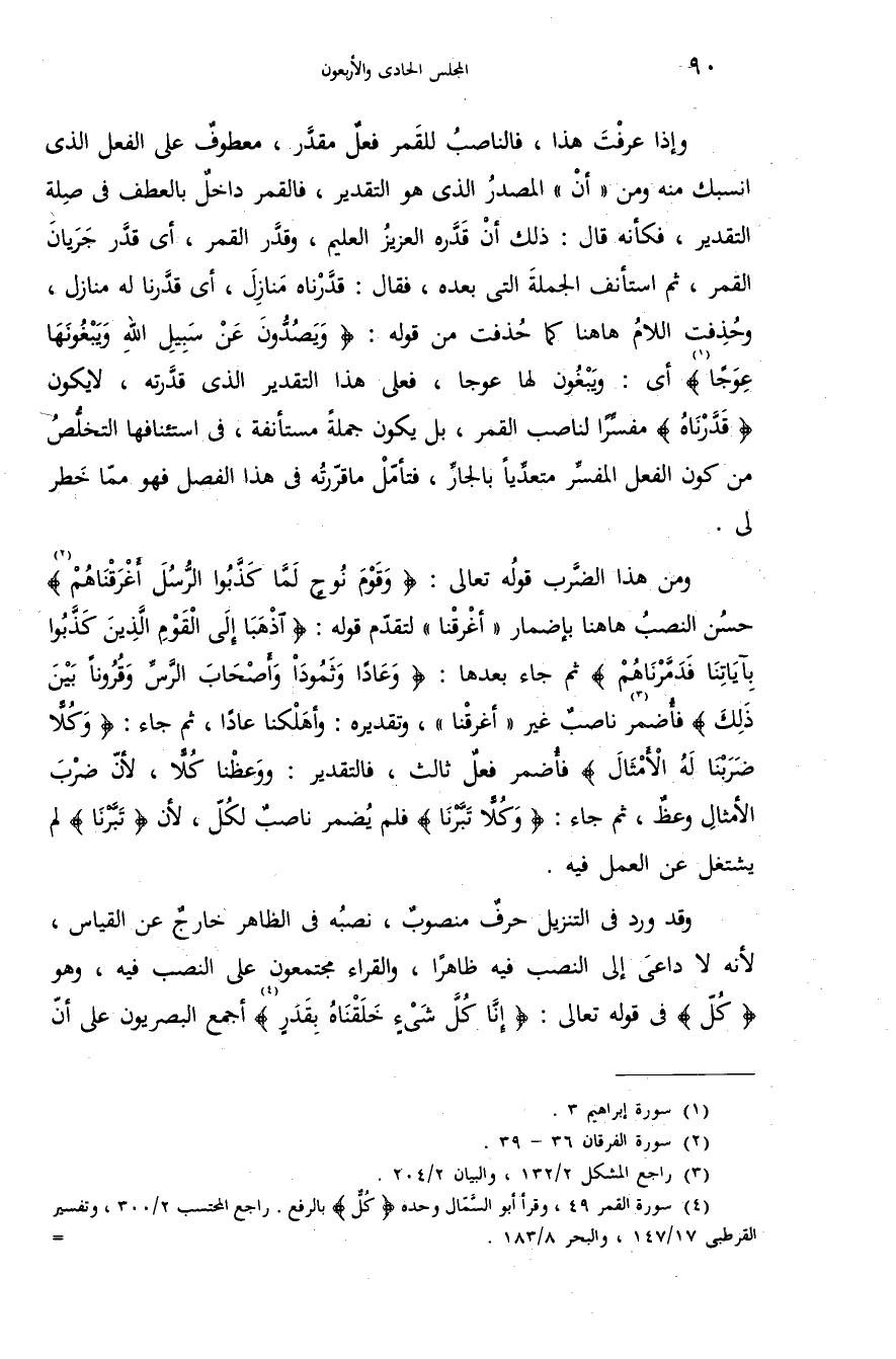 وإذا عرفت هذا، فالناصب للقمر فعل مقدّر، معطوف على الفعل الذى انسبك منه ومن «أن» المصدر الذى هو التقدير، فالقمر داخل بالعطف فى صلة التقدير، فكأنه قال: ذلك أن قدّره العزيز العليم، وقدّر القمر، أى قدّر جريان القمر، ثم استأنف الجملة التى بعده، فقال: قدّرناه منازل، أى قدّرنا له منازل، وحذفت اللام هاهنا كما حذفت من قوله: {وَيَصُدُّونَ عَنْ سَبِيلِ اللهِ وَيَبْغُونَها عِوَجاً} (¬1) أى: ويبغون لها عوجا، فعلى هذا التقدير الذى قدّرته، لا يكون {قَدَّرْناهُ} مفسّرا لناصب القمر، بل يكون جملة مستأنفة، فى استئنافها التخلّص من كون الفعل المفسّر متعدّيا بالجارّ، فتأمّل ما قرّرته فى هذا الفصل فهو ممّا خطر لى.