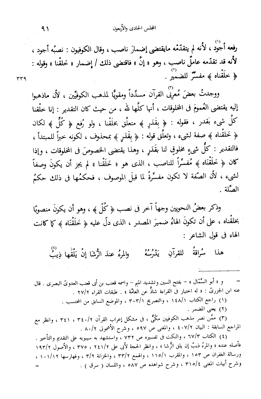 ووجدت بعض معربى (¬3) القرآن مسدّدا ومقويّا لمذهب الكوفيّين، لأن ما ذهبوا إليه يقتضى العموم فى المخلوقات، أنها كلّها لله، من حيث كان التقدير: إنا خلقنا كلّ شيء بقدر، فقوله: {بِقَدَرٍ} متعلّق بخلقنا، ولو رفع {كُلَّ} لكان {خَلَقْناهُ} صفة لشيء، وتعلّق قوله: {بِقَدَرٍ} بمحذوف، لكونه خبرا للمبتدإ، فالتقدير: كلّ شيء مخلوق لنا بقدر، وهذا يقتضى الخصوص فى المخلوقات، وإذا كان {خَلَقْناهُ} مفسّرا للناصب، الذى هو «خلقنا» لم يجز أن يكون وصفا لشيء، لأن الصّفة لا تكون مفسّرة لما قبل الموصوف، فحكمها فى ذلك حكم الصّلة.