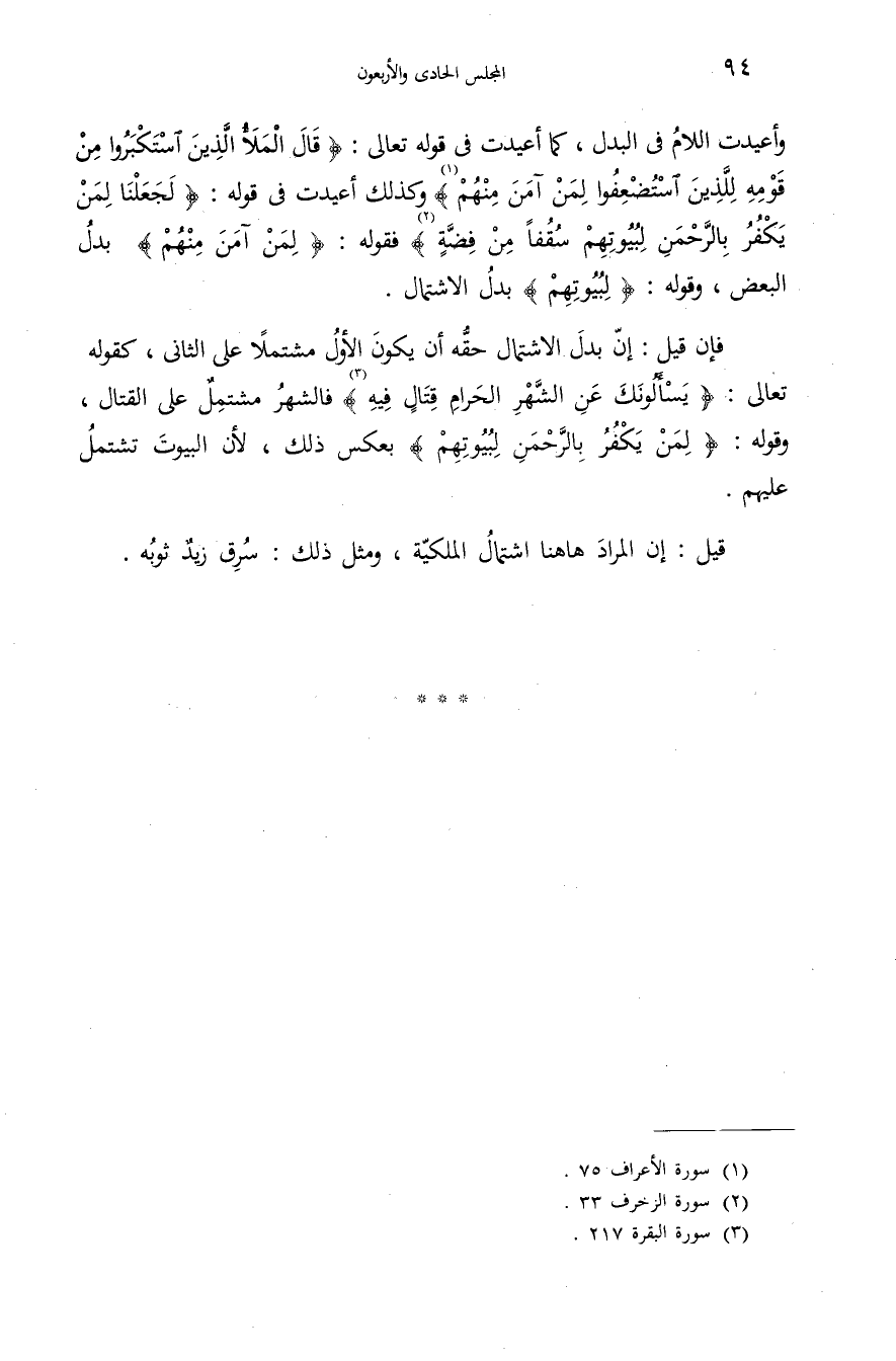 وأعيدت اللام فى البدل، كما أعيدت فى قوله تعالى: {قالَ الْمَلَأُ الَّذِينَ اِسْتَكْبَرُوا مِنْ قَوْمِهِ لِلَّذِينَ اُسْتُضْعِفُوا لِمَنْ آمَنَ مِنْهُمْ} (¬1) وكذلك أعيدت فى قوله: {لَجَعَلْنا لِمَنْ يَكْفُرُ بِالرَّحْمنِ لِبُيُوتِهِمْ سُقُفاً مِنْ فِضَّةٍ} (¬2) فقوله: {لِمَنْ آمَنَ مِنْهُمْ} بدل البعض، وقوله: {لِبُيُوتِهِمْ} بدل الاشتمال.
