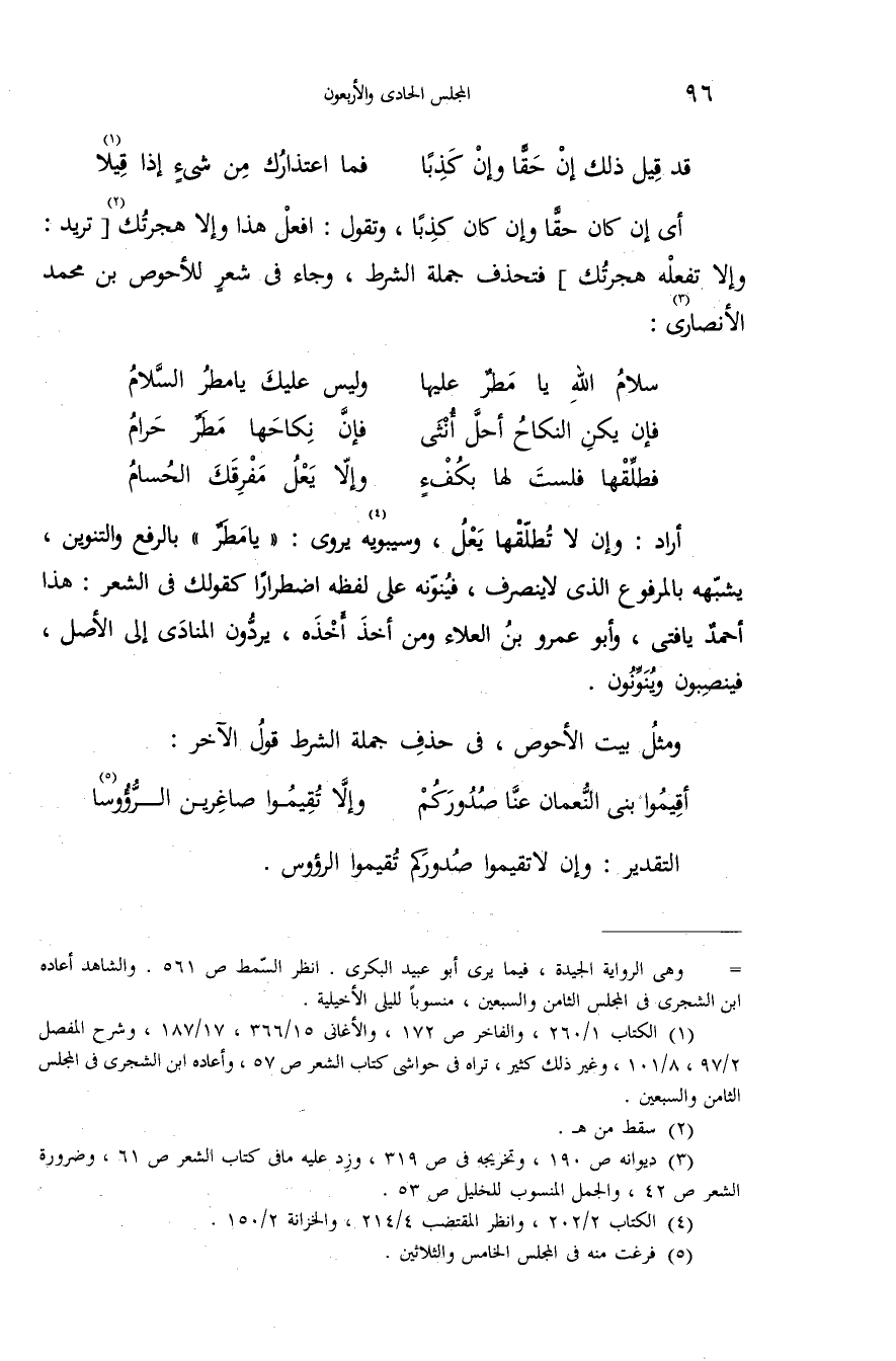 (¬1) الكتاب 1/ 260، والفاخر ص 172، والأغانى 15/ 366،17/ 187، وشرح المفصل 2/ 97،8/ 101، وغير ذلك كثير، تراه فى حواشى كتاب الشعر ص 57، وأعاده ابن الشجرى فى المجلس الثامن والسبعين.