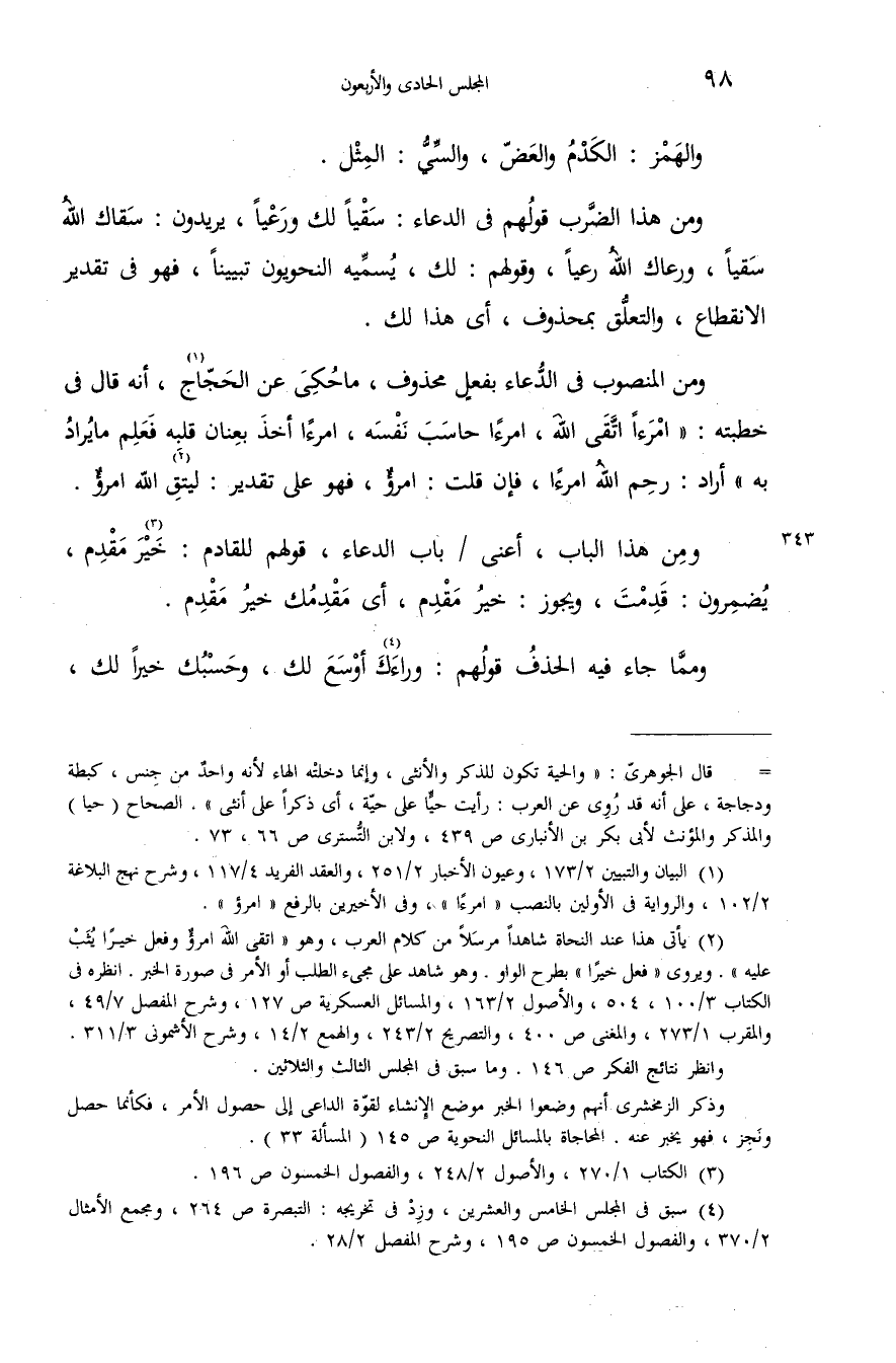 (¬4) سبق فى المجلس الخامس والعشرين، وزد فى تخريجه: التبصرة ص 264، ومجمع الأمثال 2/ 370، والفصول الخمسون ص 195، وشرح المفصل 2/ 28.