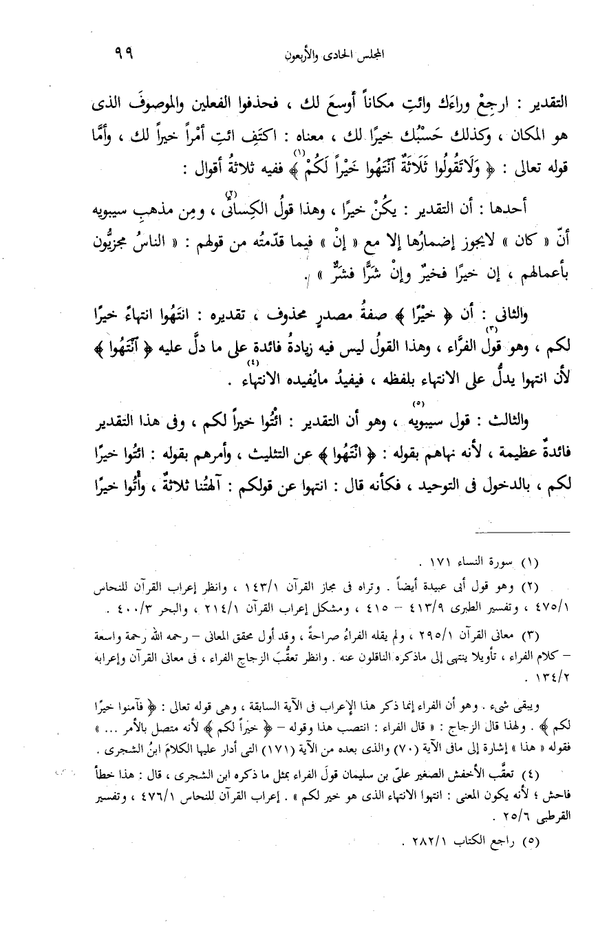 (¬4) تعقّب الأخفش الصغير علىّ بن سليمان قول الفراء بمثل ما ذكره ابن الشجرى، قال: هذا خطأ فاحش؛ لأنه يكون المعنى: انتهوا الانتهاء الذى هو خير لكم». إعراب القرآن للنحاس 1/ 476، وتفسير القرطبى 6/ 25.