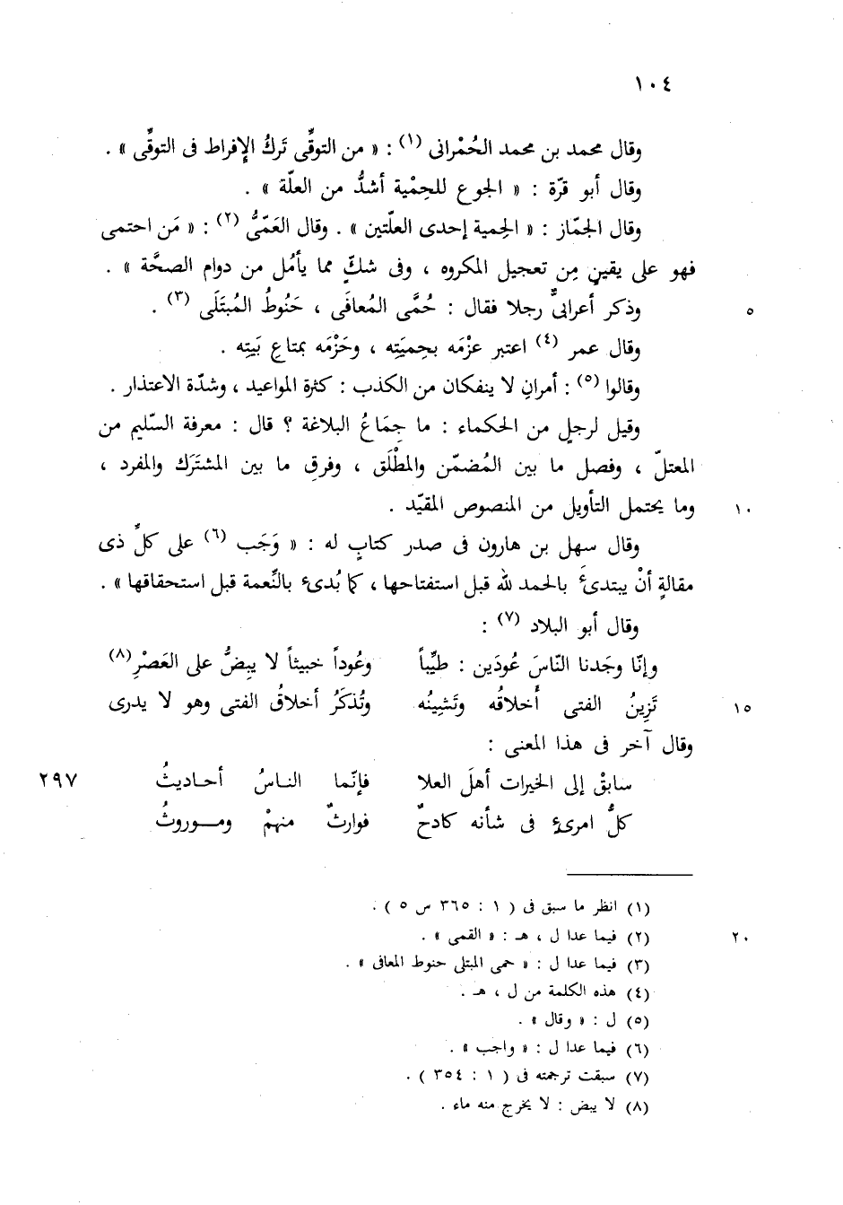 وقال القمي من احتمى فهو على يقين من تعجيل المكروه وفي شك مما يأمل من دوام الصحة وقال اعتبر عزمه بحميته وحزمه بمتاع بيته قال وذكر اعرابي رجلا فقال حناء المبتلى حنوط المعافى