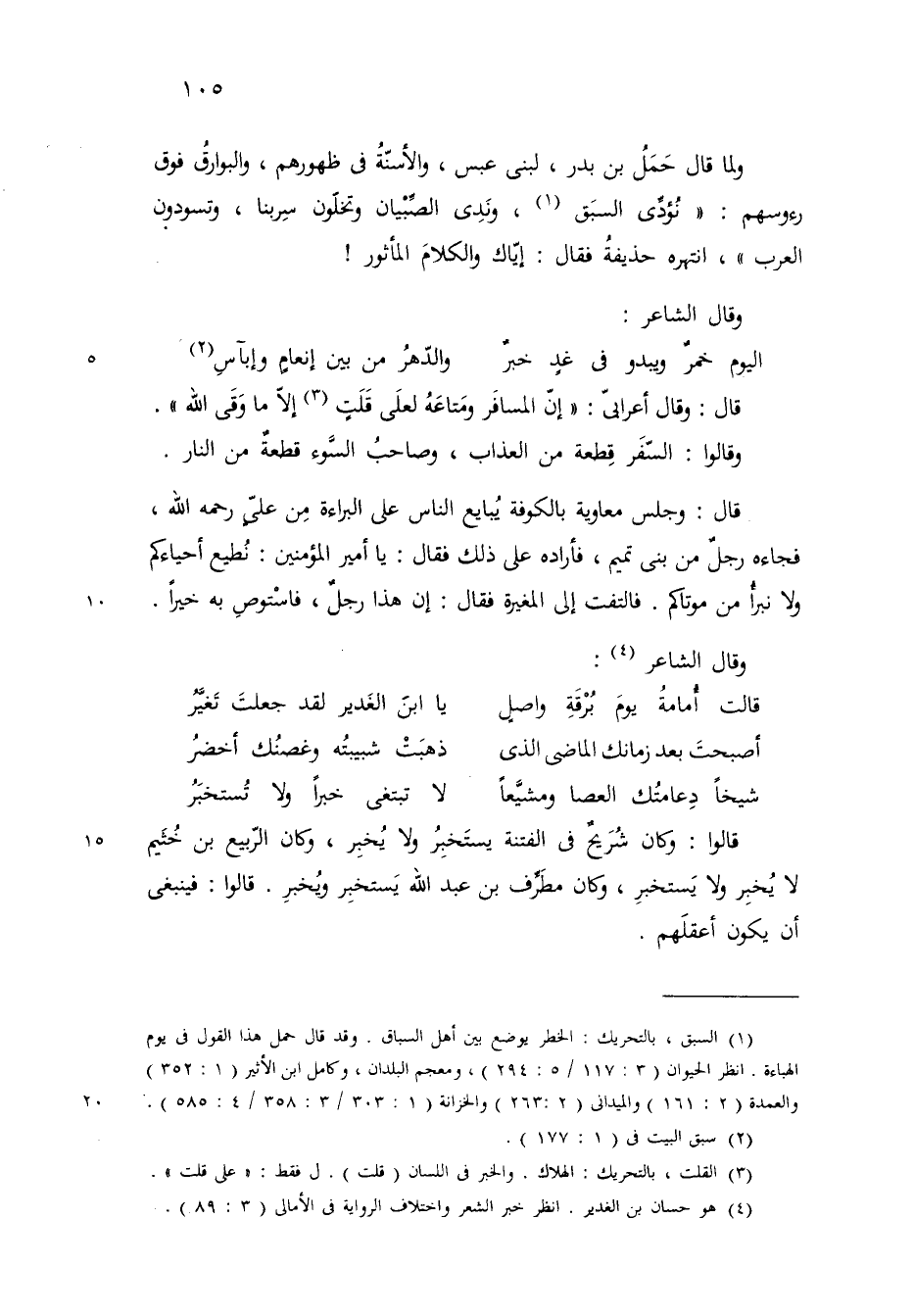 ولما قال حمل بن بدر لبني عبس والاسنة في ظهورهم والبوارق فوق رؤوسهم نؤدي السبق وندى الصبيان وتخلون سربنا وتسودون العرب انتهره حذيفة وقال اياك والكلام المأثور