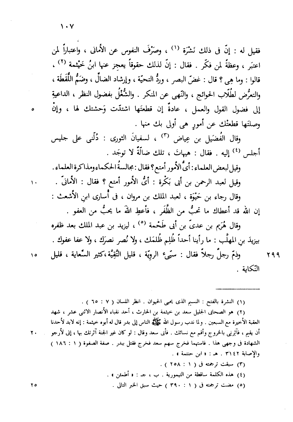 فقيل له ان في ذلك نشرة وصرف النفوس عن الاماني واعتبارا لمن اعتبر وعظة لمن فكر فقال ان في ذلك حقوقا يعجز عنها ابن خيثمة قالوا وما هي قال غض الطرف ورد التحية وارشاد الضال وضم اللقطة والتعرض لطلاب الحوائج والنهي عن المنكر والشغل بفضول النظر الداعية الى فضول القول والعمل وعادة قطعتها اشتدت وحشتك وان صلتها قطعتك عن أمور هي أولى بك