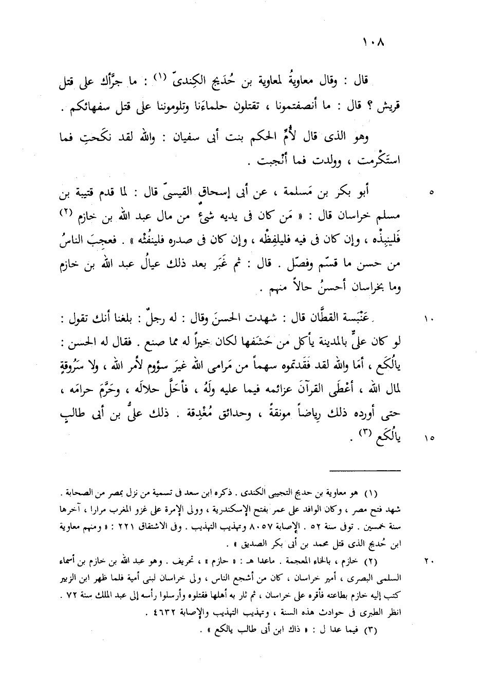 قال معاوية لمعاوية بن حديج الكندي ما جرأك على قتل قريش قال ما أنصفتمونا تقتلون حلماءنا وتلوموننا على قتل سفهائكم وهو الذي قال لأم الحكم بنت ابي سفيان والله لقد نكحت فما استكرمت وولدت فما أنجبت