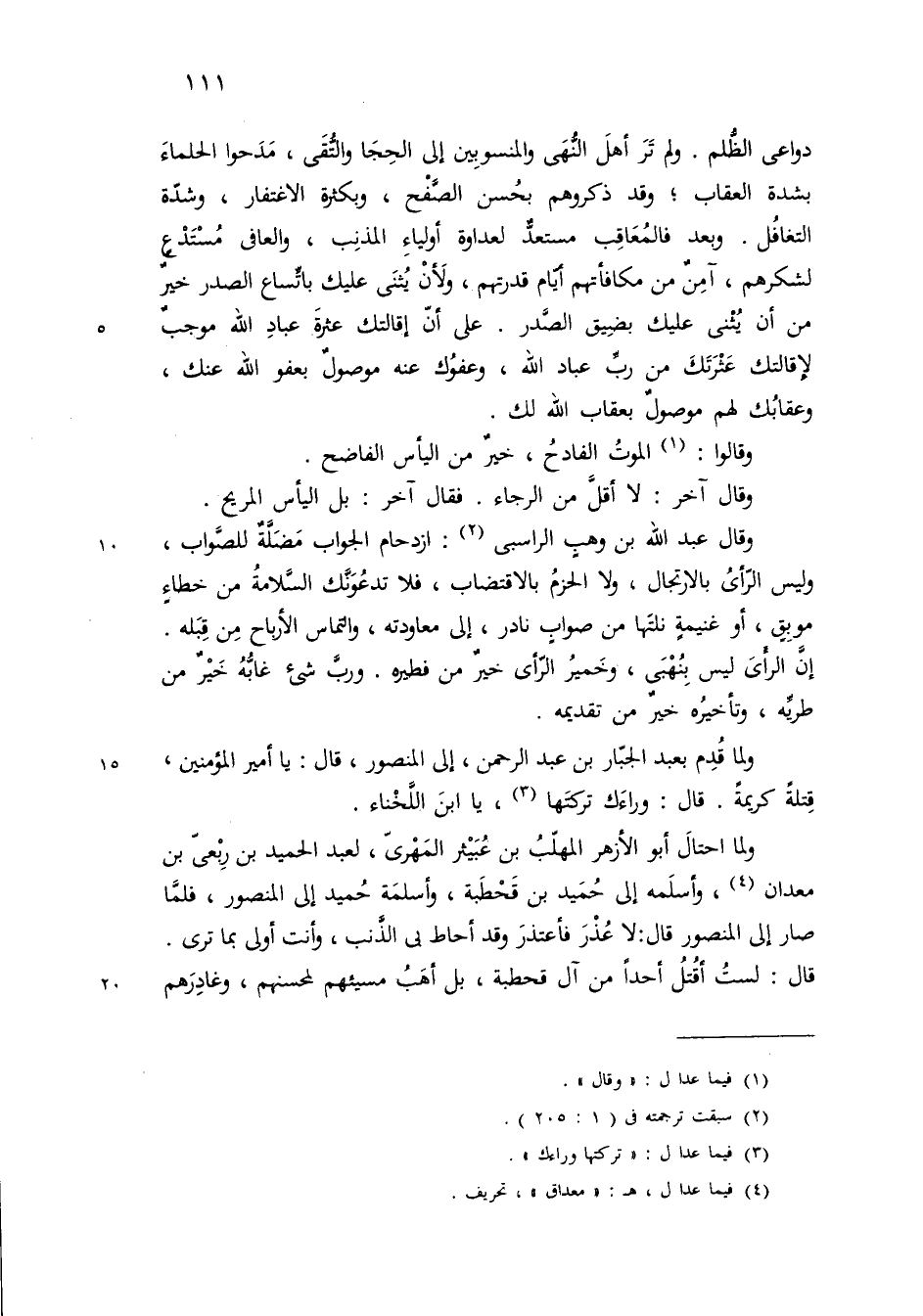 ولما احتال أبو الازهر المهلب بن عبيثر المهري لعبد الحميد بن ربعي بن خالد ابن مغداق وأسلمه الى حميد بن قحطبة وأسلمه حميد الى المنصور ولما صار الى المنصور قال لا عذر فأعتذر وقد احاط بي الذنب وانت أولى بما ترى قال لست أقتل احدا من آل قحطبة بل أهب مسيئهم لمحسنهم وغادرهم@