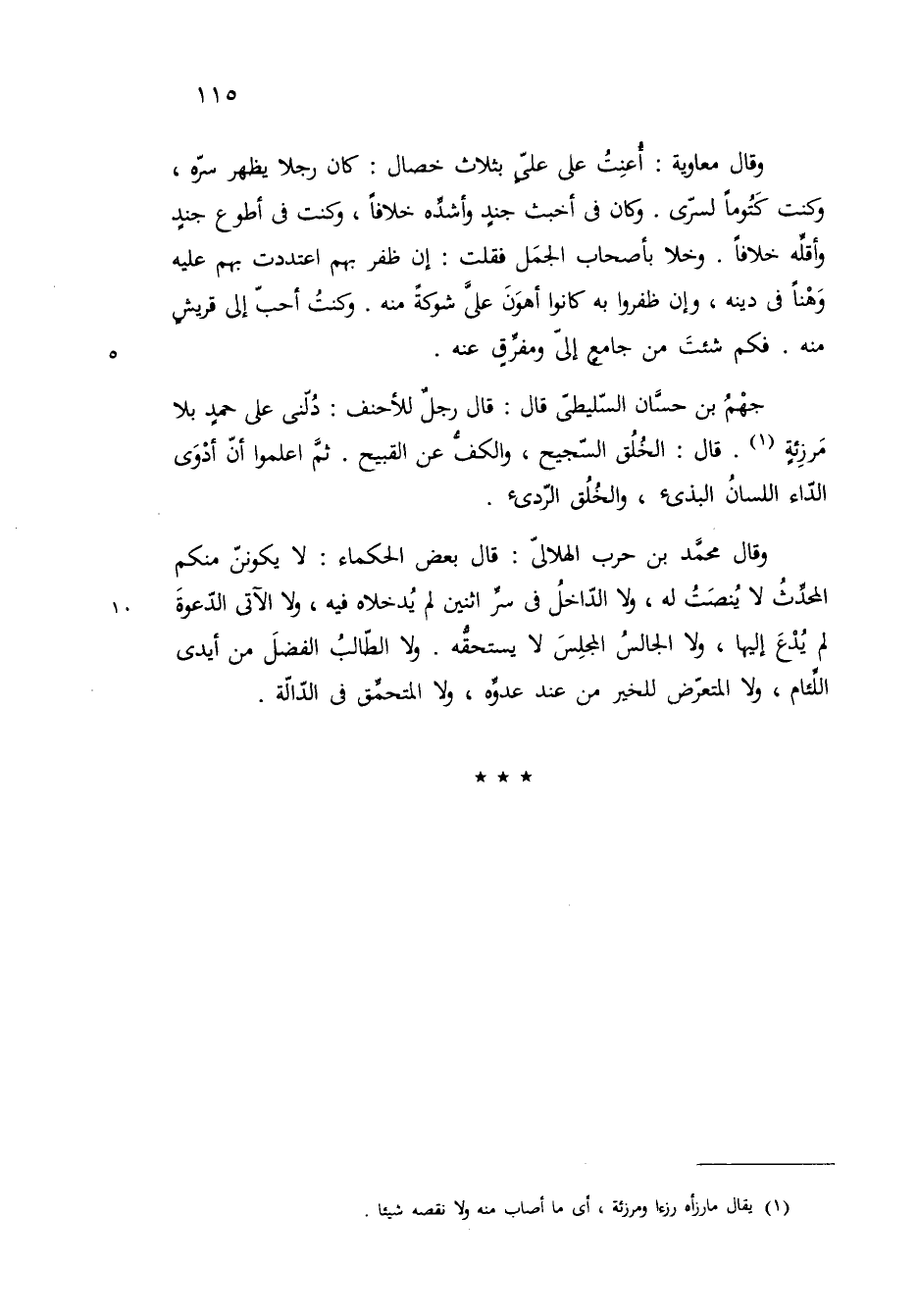 وقال جهم بن حسان السليطى قال رجل للاحنف دلني على حمد بلا مرزئة قال الخلق السجيح والكف عن القبيح ثم اعلموا ان أدوا الداء اللسان البذيء والخلق الرديء