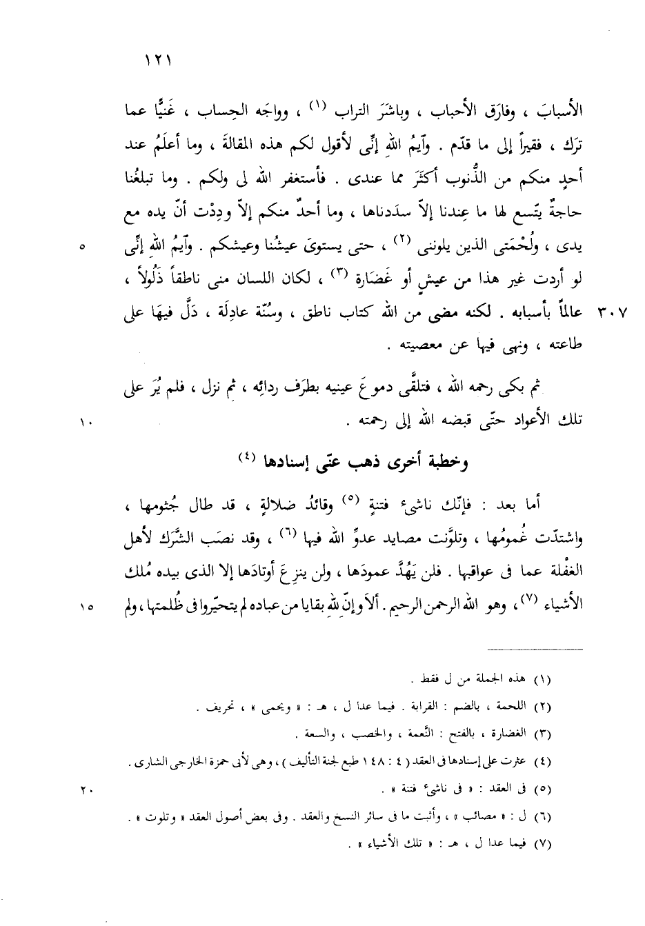 الاسباب وفارق الاحباب وواجه الحساب غنيا عما ترك فقيرا الى ما قدم وأيم الله اني لأقول لكم هذه المقالة وما أعلم عند احد منكم من الذنوب أكثر مما عندي فأستغفر الله لي ولكم وماتبلغنا حاجة يتسع لها ما عندنا إلا سددناها ولا أحد منكم إلا وددت ان يده مع يدي ويحمي الذين يلونني حتى يستوى عيشنا