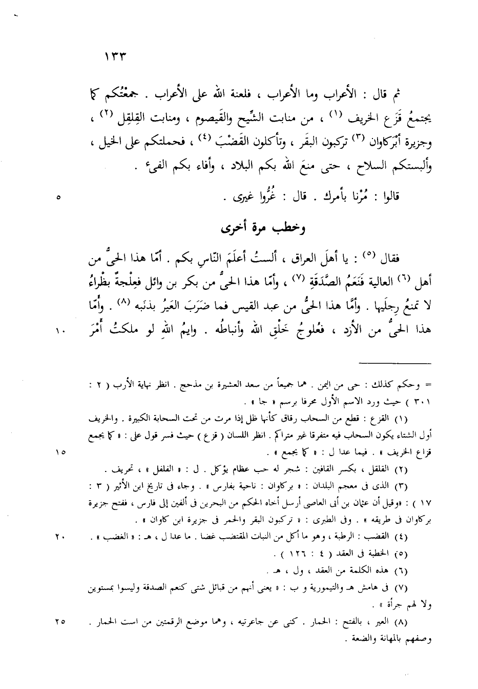 ثم قال الأعراب وما الأعراب فلعنه الله علىالاعراب جمعتكم كما يجمع قرع الخريف من منابت الشيح والقيصوم ومنابت القلقل وجزيرة ابن كاوان تركبون البقر وتأكلون العضبة فحملتكم على الخيل وألبستكم السلاح حتى منع الله بكم البلاد وأفاء بكم الفيء