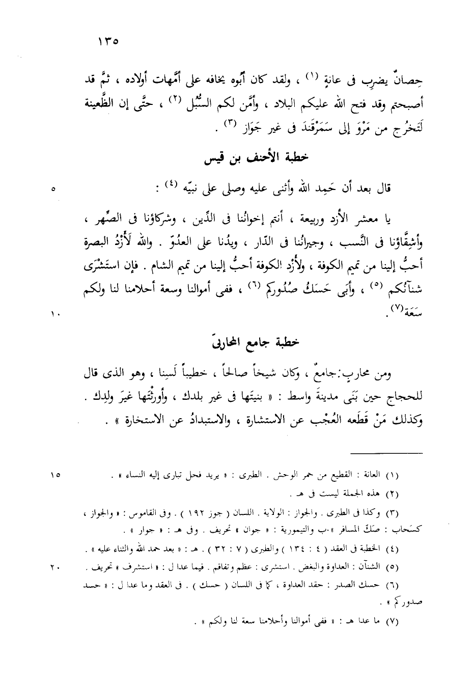 يا معشر الازد وربيعة أنتم اخواننا في الدين وشركاؤنا في الصهر وأشقاقنا في النسب وجيراننا في الدار ويدنا على العدو والله لازد البصرة أحب إلينا من تميم الكوفة ولآزد الكوفة أحب إلينا من تميم الشام فان استشرف شنآنكم وأبى حسد صدوركم ففي أموالنا وسعة احلامنا لنا ولكم سعة