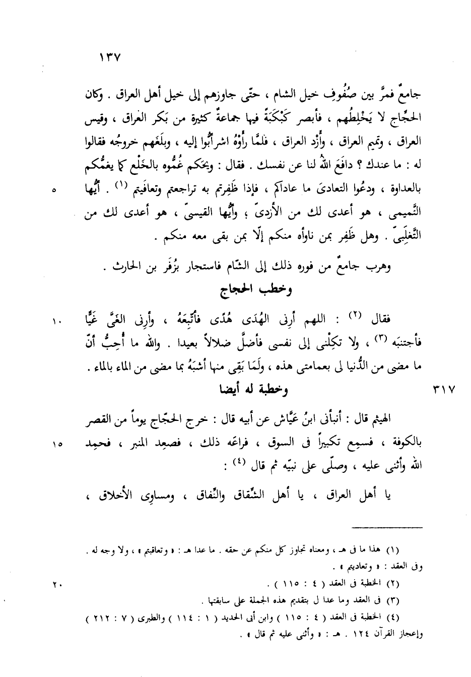 جامع فمر بين صفوف خيل الشام حتى جاوز الىخيل أهل العراق - وكان الحجاج لا يخلطهم - فأبصر كوكبة فيها جماعة من بكر العراق وتميم العراق وأزد العراق وقيس العراق فلما رأوه اشرأبوا اليه وبلغهم خروجه فقالوا له ما عندك دافع الله لنا عن نفسك فقال ويحكم عموه بالخلع كما يعمكم بالعداوة ودعوا التعادي ما عاداكم فاذا ظفرتم به تراجعتم وتعاقبتم ايها التميمي هوأعدى لك من الأزدي وأيها القيسي هو أعدى لك من التغلبي وهل ظفر بمن ناوأه الا بمن بقي معه منكم وهرب جامع من فوره ذلك الى الشام فاستجار بزفر بن الحارث