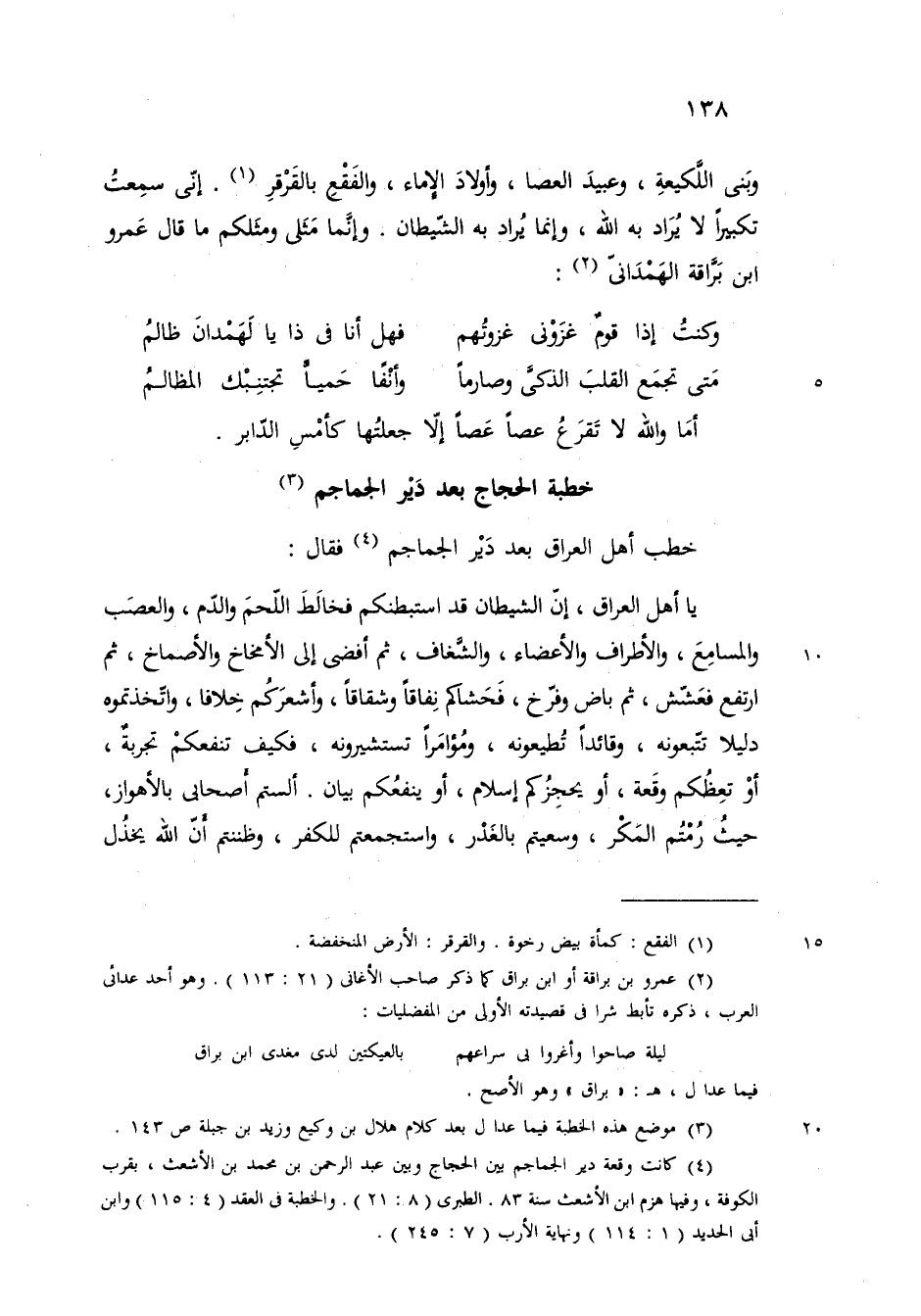 وبني اللكيعة وعبيد العصا وأولاد الإماء والفقع بالقرقر إني سمعت تكبيرا لا يراد به الله وإنما يراد به الشيطان وإنما مثلي ومثلكم ما قال عمرو بن براق الهعداني