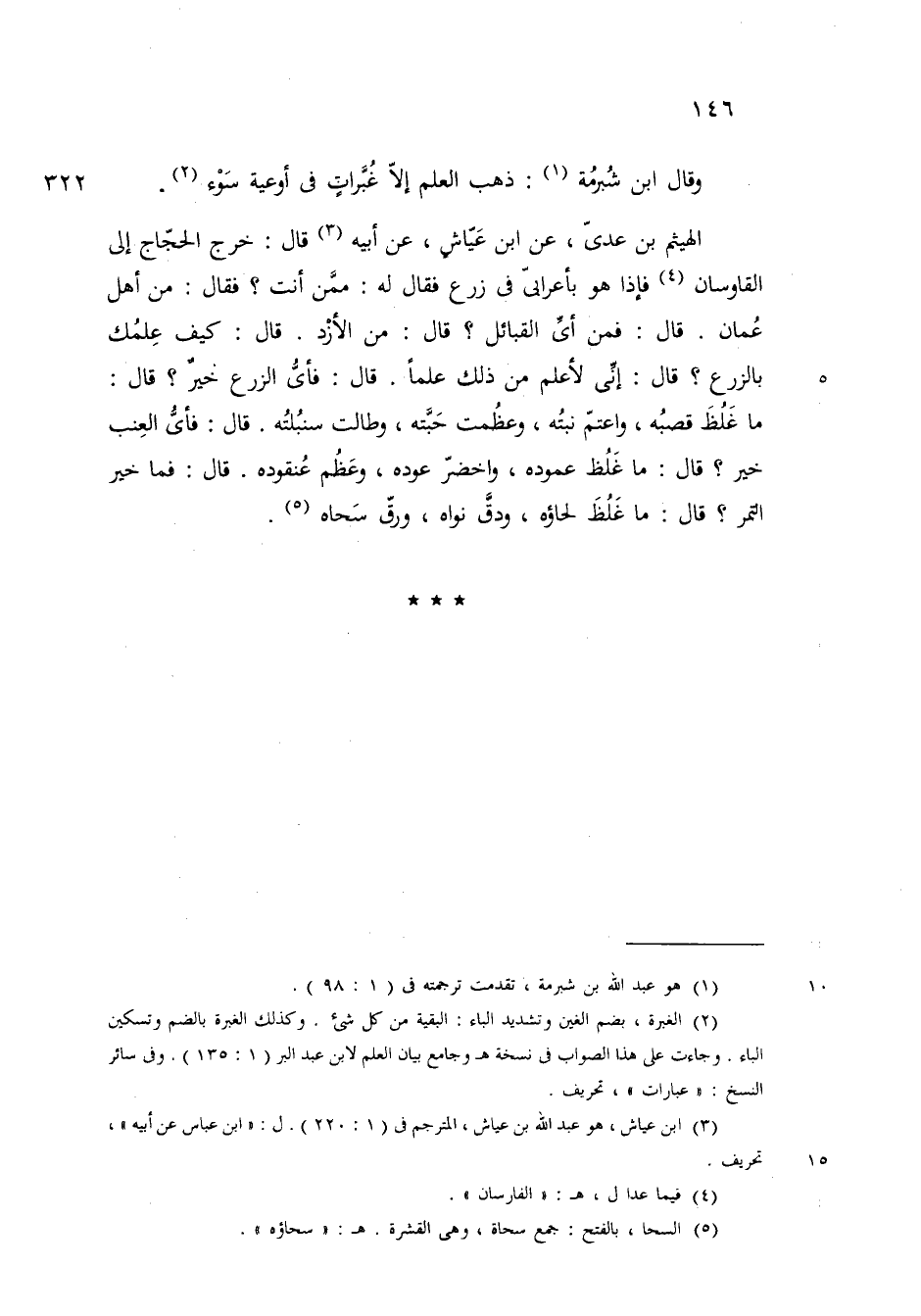 وقال ابن شبرمة ذهب العلم الا عبارات في أوعية سوء