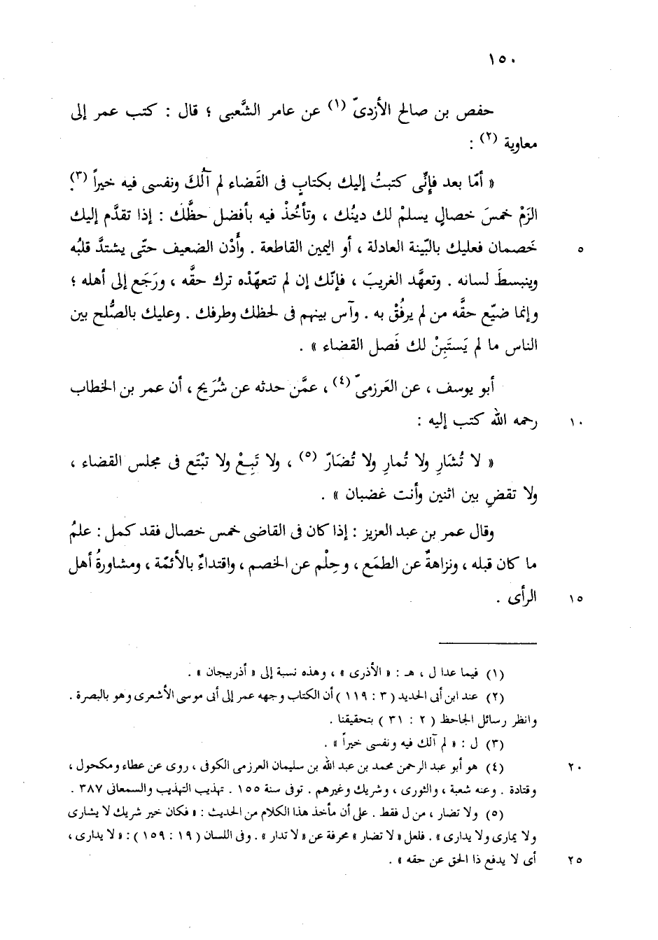 قال حفص بن صالح الازدي عن عامر الشعبي كتب عمر الى معاوية