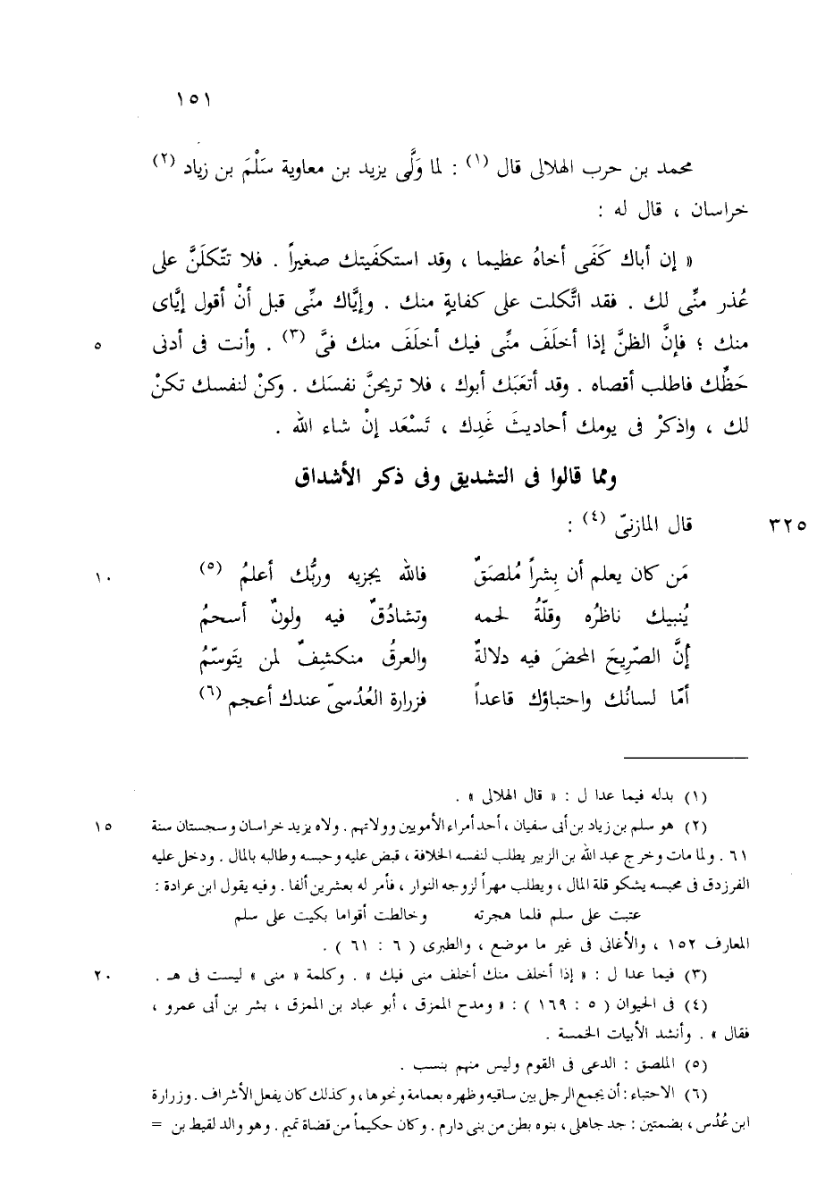 وقال الهلالي لما ولي يزيد بن معاوية سلم بن زياد علىخراسان قال له ان أباك كفى أخاه عظيما وقد استكفيتك صغيرا فلا تتكلن على عذر مني لك فقد اتكلت على كفاية منك وإياك مني قبل ان اقول إياي منك فان الظن اذا أخلف منك أخلف مني فيك وأنت في أدنى حظك فاطلب أقصاه وقد اتعبك ابوك فلا تريحن نفسك وكن لنفسك تكن لك واذكر في يومك أحاديث غدك تسعد ان شاء الله تعالى