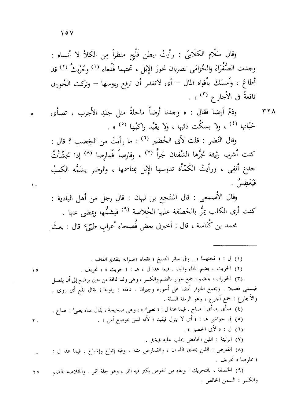 وقال النضر قلت لأبي الخضير ما اعجب ما رأيت من الخصب قال كنت اشرب رثئة تجرها الشفنان جرا وقارصا ممارصا اذا تجشأت جدع أنفي ورأيت الكمأة تدوسها الإبل بمناسمها والوضر يشمه الكلب فيعطس