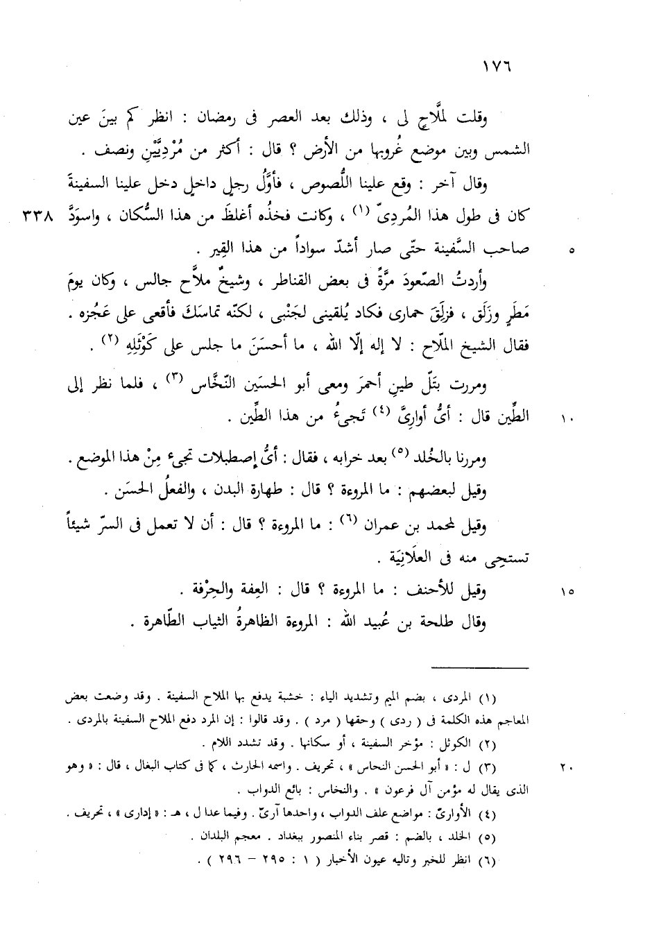 وقلت لملاح لي وذلك بعد العصر في رمضان انظركم بين عين الشمس وبين موضع غروبها من الارض قال أكثر من مرديين ونصف وقال آخر وقع علينا اللصوص فأول رجل دخل علينا السفينة كان في طول هذا المردى وكانت فخذه اغلظ من هذا السكان واسود وجه صاحب السفينة حتى صار اشد سوادا من هذا القير وأردت الصعود مرة في بعض القناطر وشيخ ملاح جالس وكان يوم مطر وزلق فزلق حماري فكاد يلقيني بجنبي لكه تماسك فأقعى على عجزه فقال الشيخ الملاح لا إله إلا الله ما احسن ما جلس على كوثله ومررت بتل طين احمر ومعي ابو الحسين النحاس فلما نظر الى الطين قال اي اداري يجيء من هذا الطين ومررنا بالخلد بعدخرابه فقال اي اصطبلات تجيء من هذا الموضع
