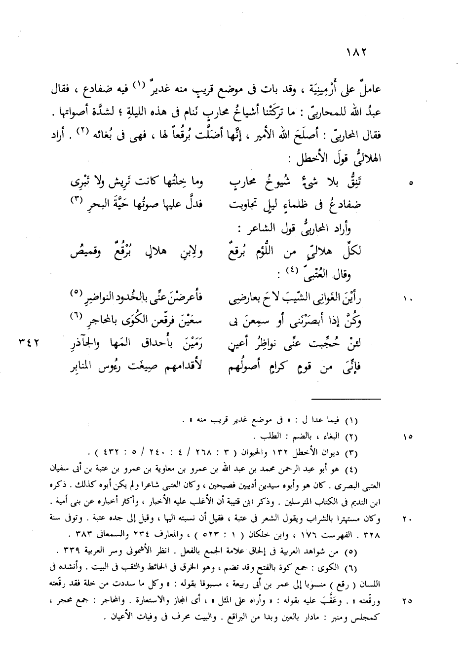 عامل على أرمينية وقد بات في موضع غدير قريب منه فيه ضفادع فقال عبد الله للمحاربي ما تركتنا أشياخ محارب ننام في هذه الليلة لشدة أصواتها قال المحاربي أصلح الله الامير انها اضلت برقعا لها فهي في بغائه أراد الهلالي قول الأخطل