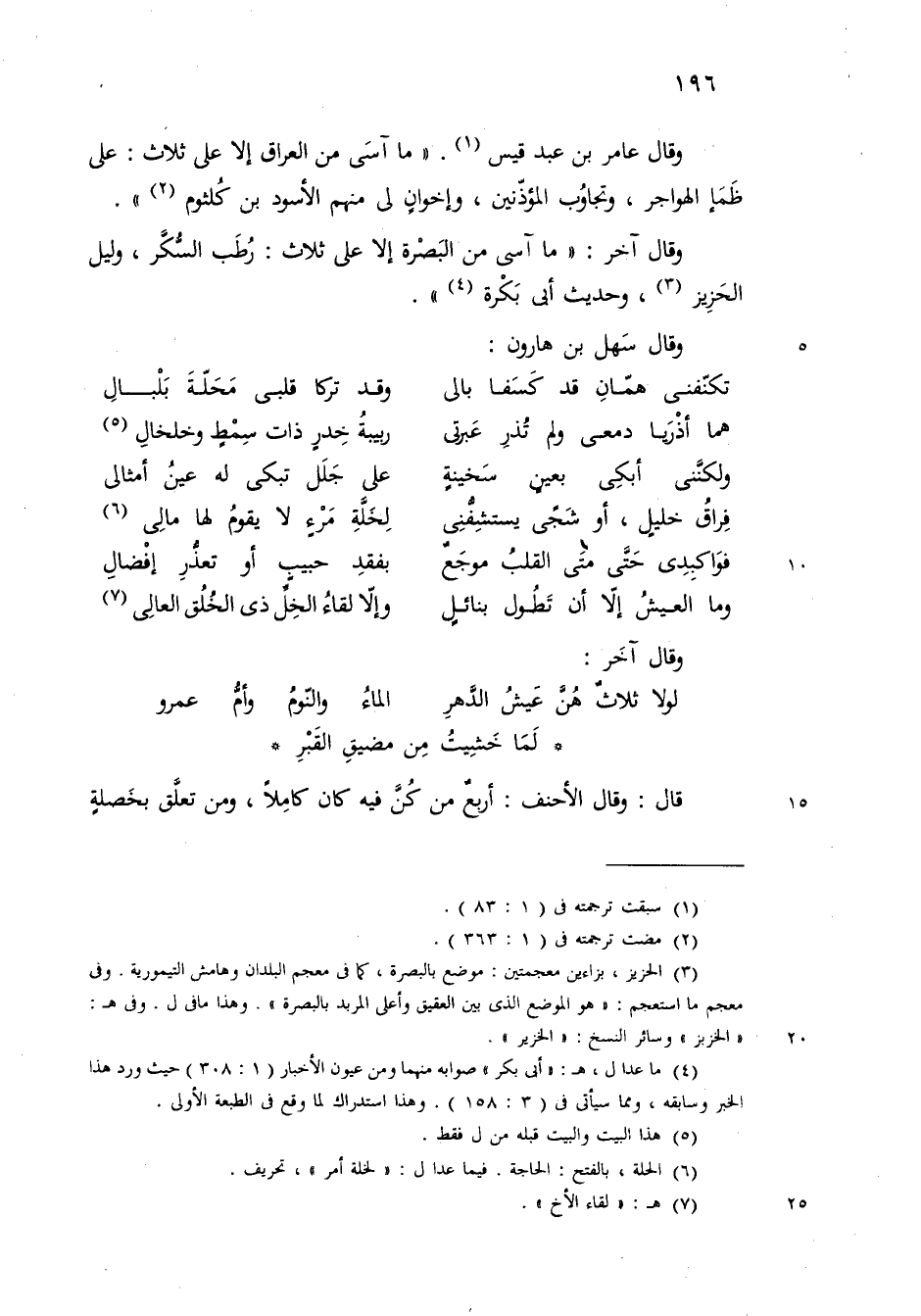 وقال آخر ما آسى من البصرة الا على ثلاث رطب السكر وليل الخرير وحديث ابن ابي بكرة