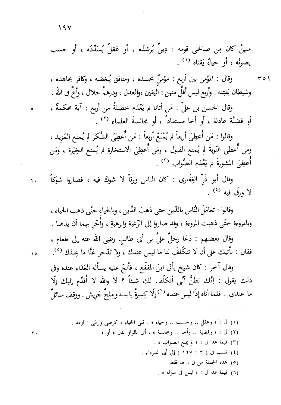 منهن كان من صالحي قومه دين يرشده او عقل يسدده او حسب يصونه اوحياء يقناه وقال المؤمن بين اربع مؤمن يحسده ومنافق يبغضه وكافر يجاهده وشيطان يفتنه وأربع لسن أقل منهن اليقين والعدل ودرهم حلال وأخ في الله
