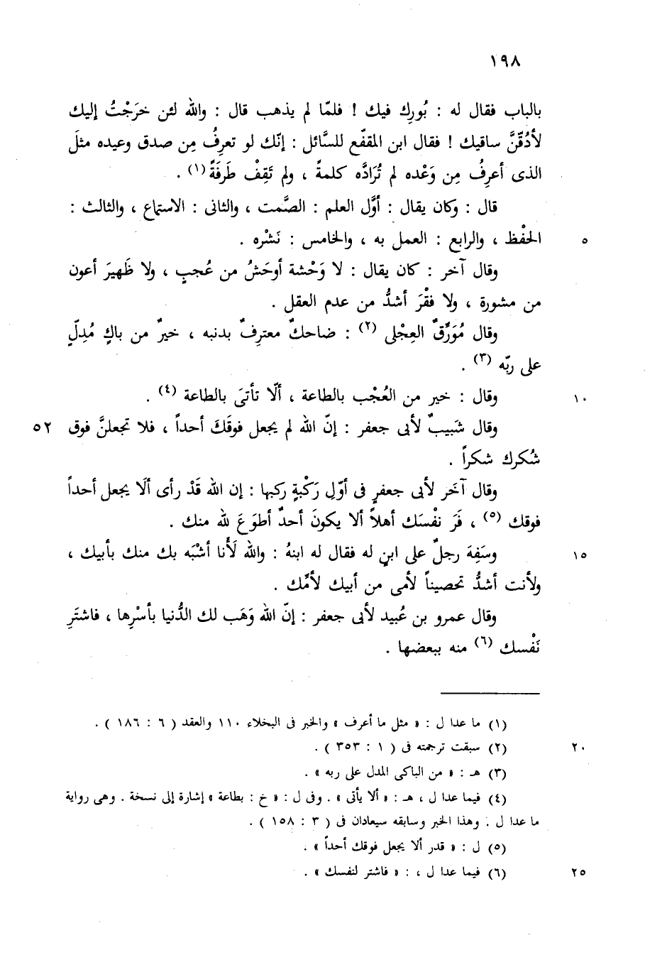 وقال عمرو بن عبيد لابي جعفر ان الله قد وهب لك الدنيا بأسرها فاشتر نفسك منه ببعضها@