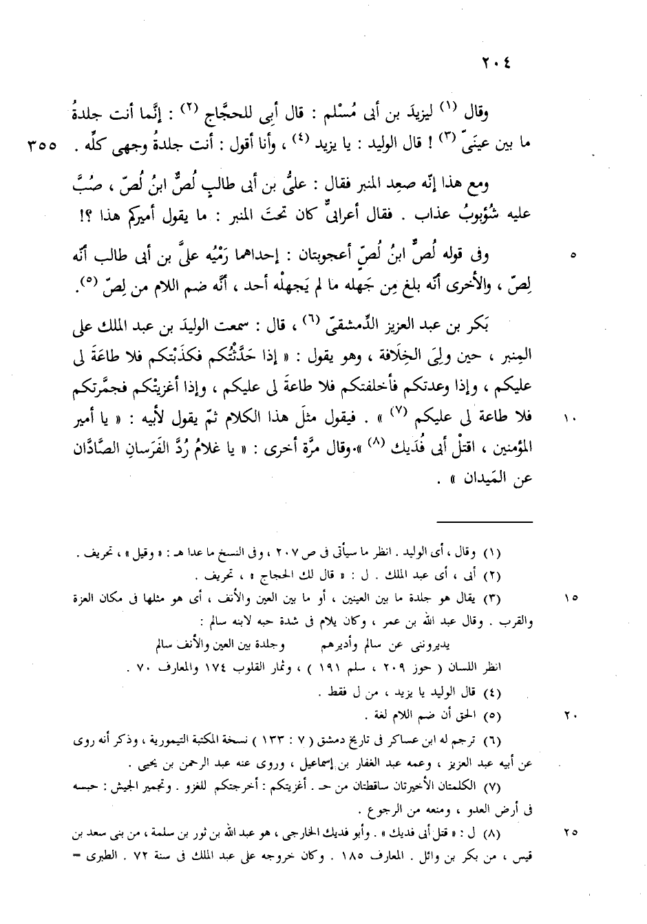 وقال يزيد لابن ابي مسلم قال ابي للحجاج انما انت جلدة ما بين عيني وانا اقول انك جلدة وجهي كله ومع هذا انه صعد المنبر فقال علي بن ابي طالب لص بن لص صب عليه شؤبوب عذاب فقال اعرابي كان تحت المنبر ما يقول اميركم هذا وفي قوله لص بن لص اعجوبتان احداهما رميه علي بن أبي طالب رضي الله تعالى عنه انه لص والاخرى انه بلغ من جهله ما لم يجهله احد انه ضم اللام في لص