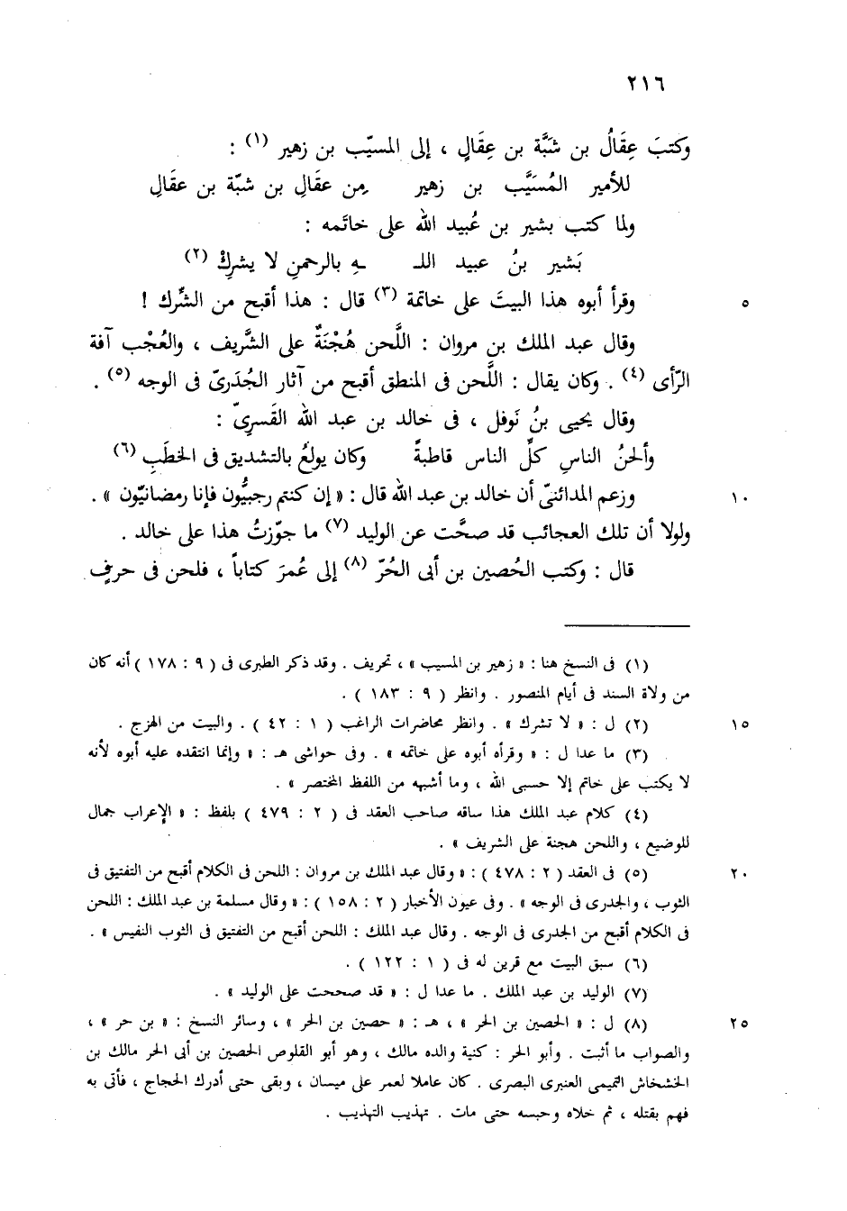 قال وكتب الحصين بن الحركتابا الى عمر فلحن في حرف@