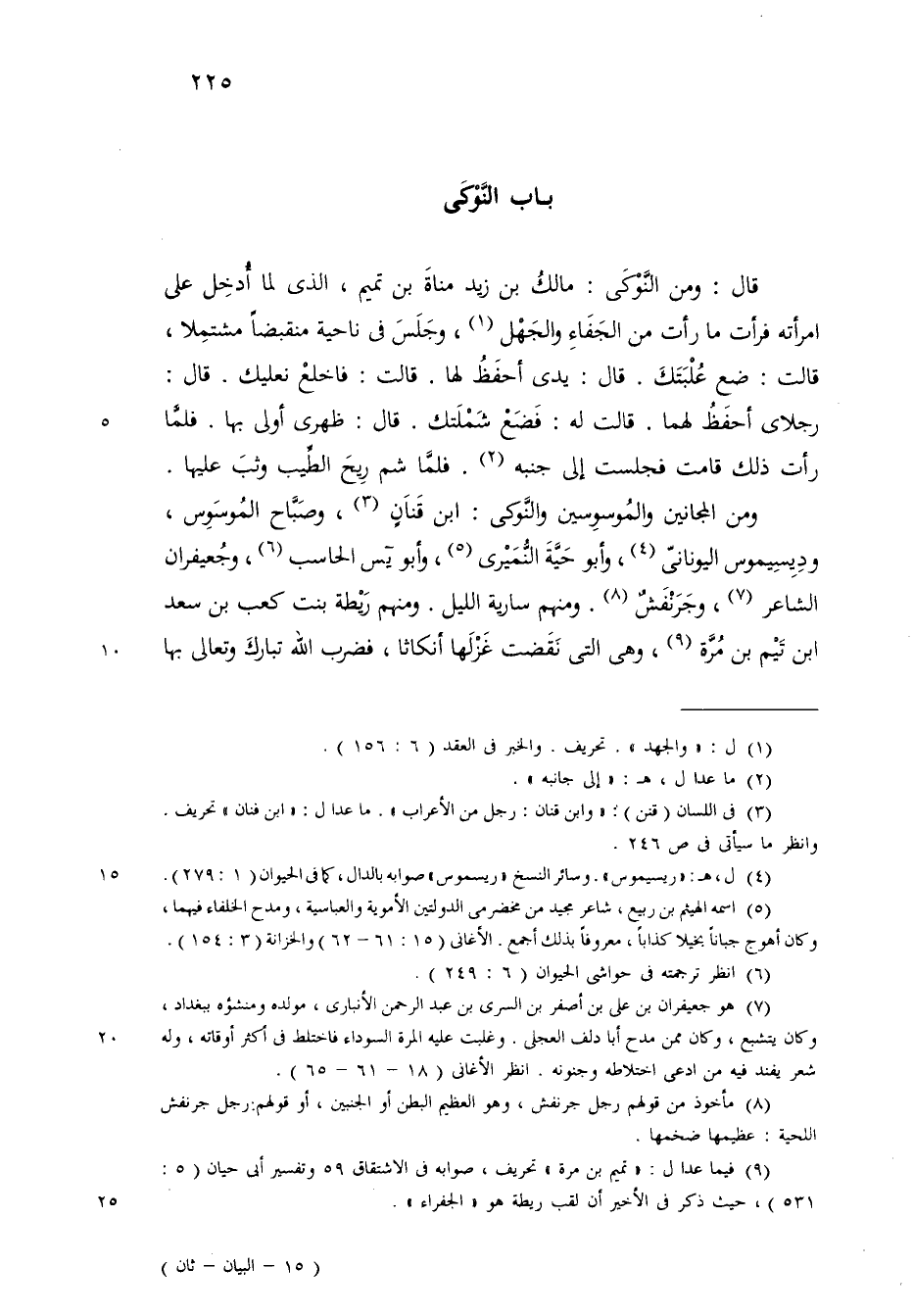 قالوا ومن النوكي مالك بن زيد مناة بن تميم الذي لما دخل على امرأته فرأت ما رأت به من الجفاء والجهل وجلس في ناحية منقبضا مشتملا قالت ضع علبتك قال يدي أحفظ لها قالت فاخلع نعليك قال رجلاي أحفظ لهما قالت فضع شملتك قال ظهري أولى بها فلما رأت ذلك قامت فجلست الى جانبه فلما شم ريح الطيب وثب عليها
