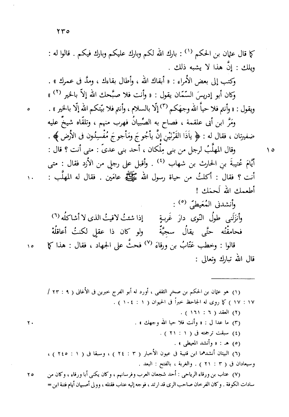 وقال المهلب لرجل من بني ملكان احد بني عدي متى انت قال ايام عتيبة بن الحارث بن شهاب وأقبل على رجل من الأزد فقال له متى أنت قال أكلت من حبوة رسول الله عامين قال أطعمك الله لحمك وأنشد المعيطي