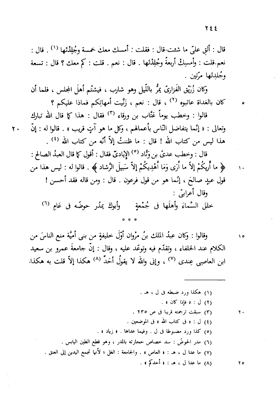 وكان عبد الملك بن مروان اول خليفة من بني أمية منع الناس من الكلام عند الخلفاء وتقدم فيه وتوعد عليه وقال ان جامعة عمرو بن سعيد بن العاص عندي واني والله لا يقول احدكم هكذا الا قلت به هكذا @