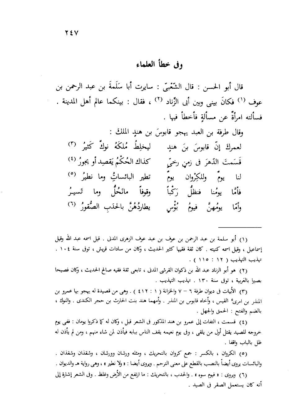 وفي خطأ العلماء قال ابو الحسن قال الشعبي سايرت أبا سلمة بن عبد الرحمن ابن عوف فكان بيني وبين ابي الزناد فقال بينكما عالم اهل المدينة فسألته امراته عن مسألة فأخطا فيها