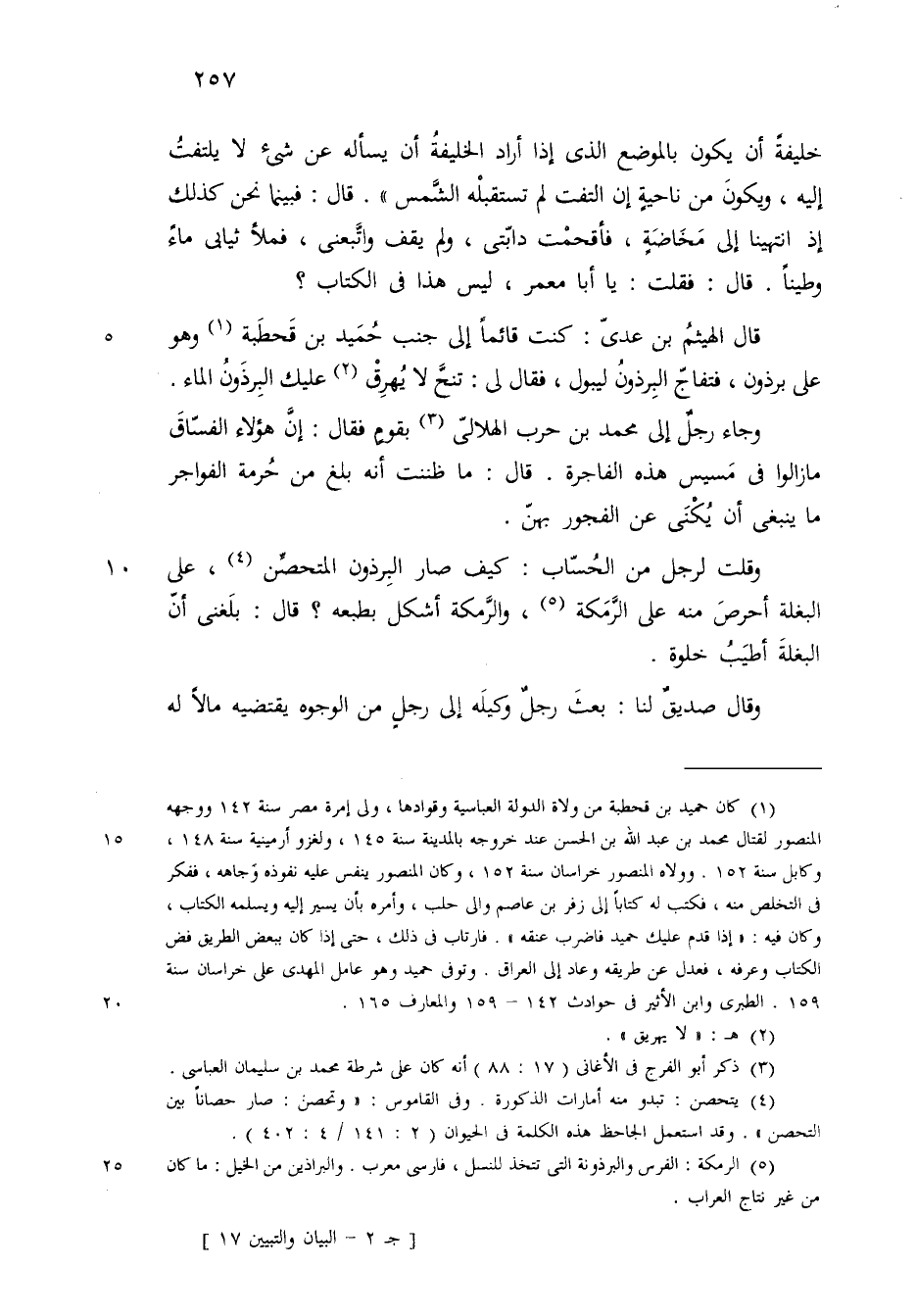 قال الهيثم بن عدي كنت قائما الى حميد بن قحطبة وهو علي برذون فتفاج