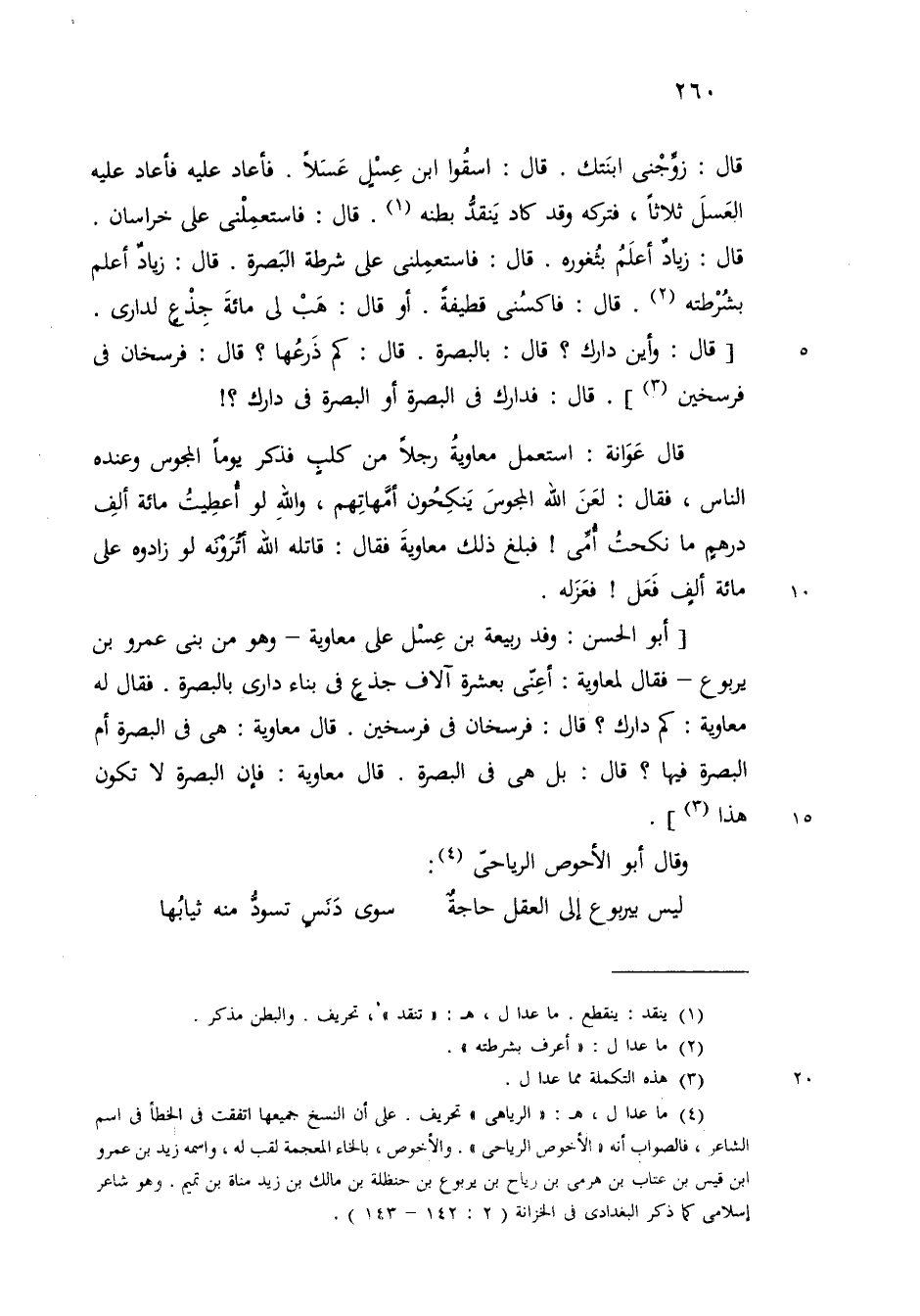 وقال ابو الحسن وفد ربيعة بن عسل وهو من بني عمرو بن يربوع على معاوية فقال لمعاوية أعني بعشرة الآف جذع في بناء داري بالبصرة فقال له معاوية كم دارك قال فرسخان في فرسخين قال معاوية هي في البصرة أم البصرة فيها قال بل هي في البصرة قال معاوية فان البصرة لا تكون هكذا