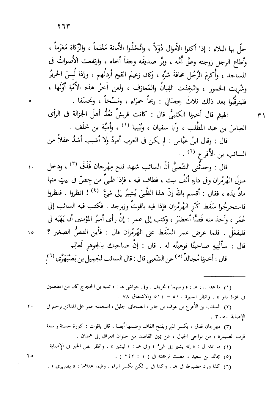 قال حدثني الشعبي ان السائب شهد فتح مهرجان قذق ودخل منزل الهرمزان وفي داره ألف بيت فطاف فيه فاذا ظبي من جص في بيت منها ماد يده فقال أقسم بالله انه يشير الى شيء انظروا فنظروا فاستخرجوا سفط كنز الهرمزان فاذ فيه ياقوت وزبرجد فكتب فيه السائب الى عمر وأخذ منه فصا أخضر وكتب الى عمر ان رأى أمير المؤمنين ان يهبه لي فليفعل فلما عرض عمر السفط على الهرمزان قال فأين الفص الصغير قال عمر سألنيه صاحبنا فوهبته له فقال ان صاحبك بالجوهر لعالم
