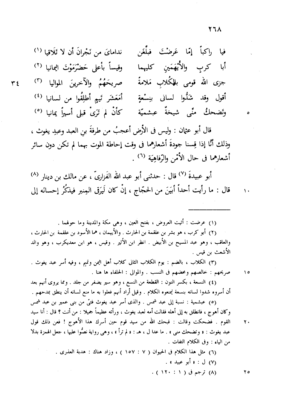 قال ابو عثمان وليس في الارض أعجب من طرفة بن العبد وعبد يغوث وذلك انا ان لسنا جودة أشعارهما في وقت إحاطة الموت بهما لم تكن دون سائر أشعارهما في حال الامن والرفاهية
