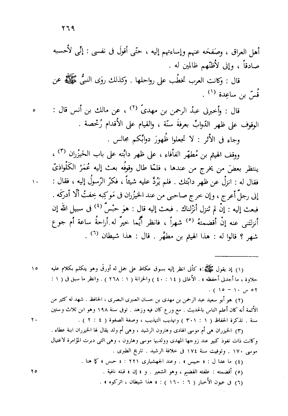 ووقف الهيثم بن مطهر الفأفاء على ظهر دابته على باب الخيزران ان ينتظر بعض من يخرج من عندها فلما طال وقوفه بعث اليه عمر الكلواذي فقال انزل عن ظهر دابتك فلم يرد عليه شيئا فكرر الرسول اليه فقال إني رجل أعرج وان خرج صاحبي من عند الخيزران في موكبه خفت ان لا أدركه فبعث اليه ان لم تنزل أنزلناك فبعث اليه قال هو حبيس في سبيل الله ان أنزلتني عنه ان أقضمته شهرا فانظر أيهما خير له أراحة ساعة او جوع شهر قالوا له هذا الهيثم بن مطهر قال هذا شيطان@