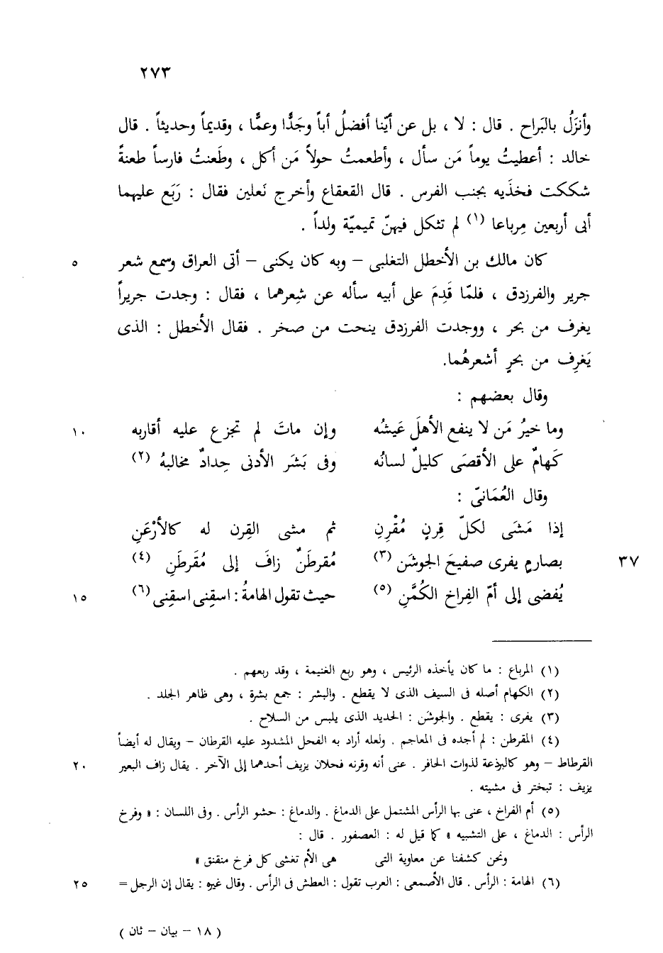 وانزل بالبراح قال لا بل على أينا افضل أبا وجدا وعما وقديما وحديثا قال خالد اعطيت يوما من سأل واطعمت حولا من أكل وطعنت فارسا طعنة شككت فخذيه بجنب الفرس قال القعقاع وأخرج نعلين فقال ربع أبي عليهما أربعين مرباعا لم تثكل فيهم تميمة ولدا